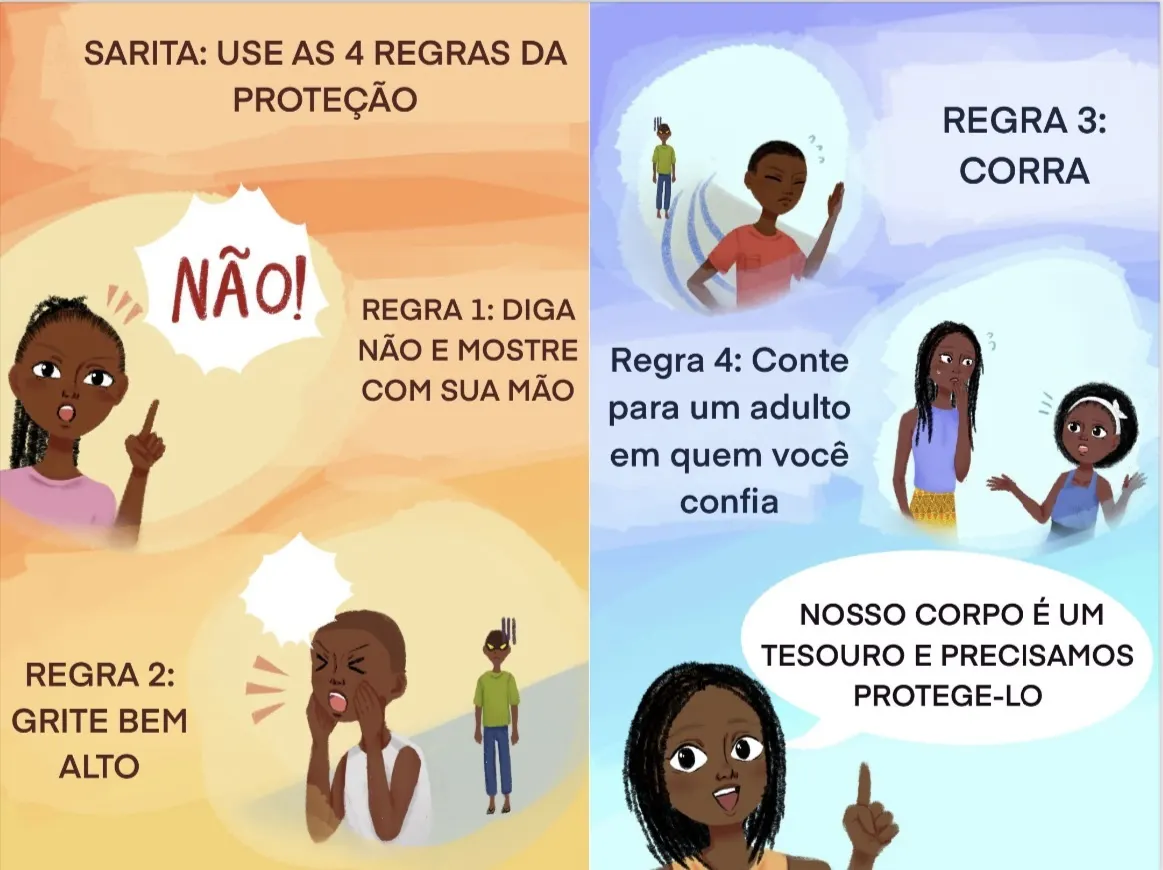 また、性虐待を受けたときにどうしたらいいか、どこに助けを求めたらいいかが、字の読めない子どもにもわかるように描いてあります。