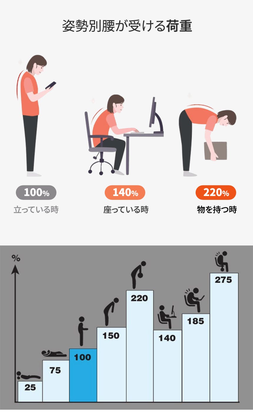 上の写真は、姿勢によって腰にかかる程度を%で確認できる例です。