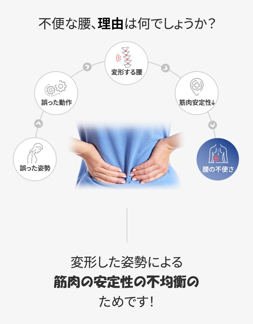 このような不便さは、ほとんど腰に悪い姿勢から始まる場合が多いです。 腰に負担を与える間違った習慣が繰り返される場合、腰に微細に変形を与え、このような小さな変形が積もり、自分の体が変形に合わせようとして、すべての行動で動きが少なくなり、そうするとだんだん腰と周辺の筋肉が弱くなることもあります。