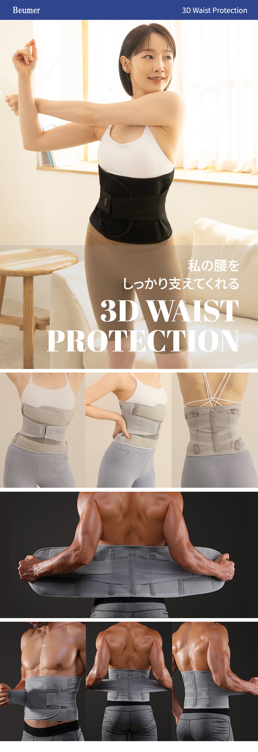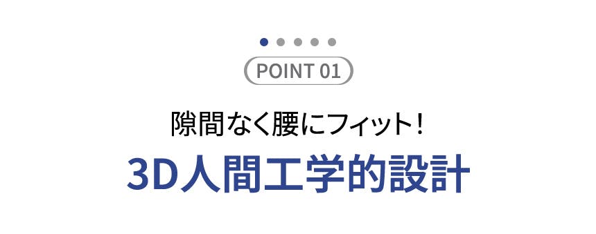 一般的な平らなストレート型腰サポーターではなく、人の正しい腰のラインを理解した設計で、腰の裏面だけを広くつかむ設計ではなく、前後を広くつかんで全体的に浮きがなく、腰の中心を支えて正しい姿勢に役立つ3D設計で製作しました。