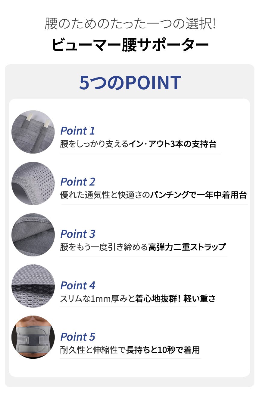 ブメール腰サポーターは、若い方からお年寄りまで腰に不便を感じる方が簡単で早く、または服の中に着用しても不便がないように薄く弾力性のある素材と3つの支持台を脊椎ライン1つと両側の腰に1つずつ2つを挿入する方式で、支持台を腰に着用して若干の動きができるように製作しました。