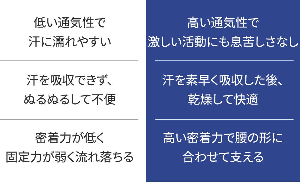 通気性に優れたエアメッシュ素材を使用し、長時間低刺激で楽に使えて洗濯機を使わずシャワー時に手軽な手洗いだけで汗や汚れを洗浄でき、乾燥も早いです。