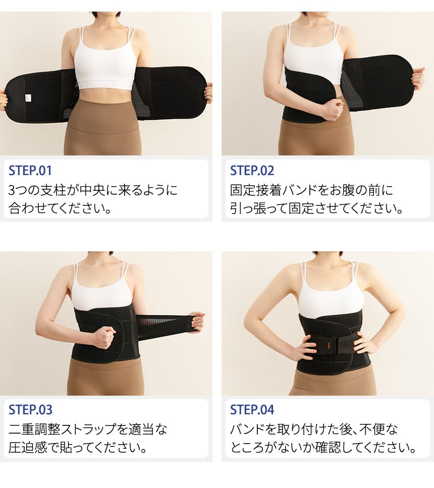 腰の裏面に上下に分離されている弾力バンドを一つにまとめ、もう一度腰を支持し、付着位置を調節できるようにして自分の腰に必要な強弱で調節が可能です。