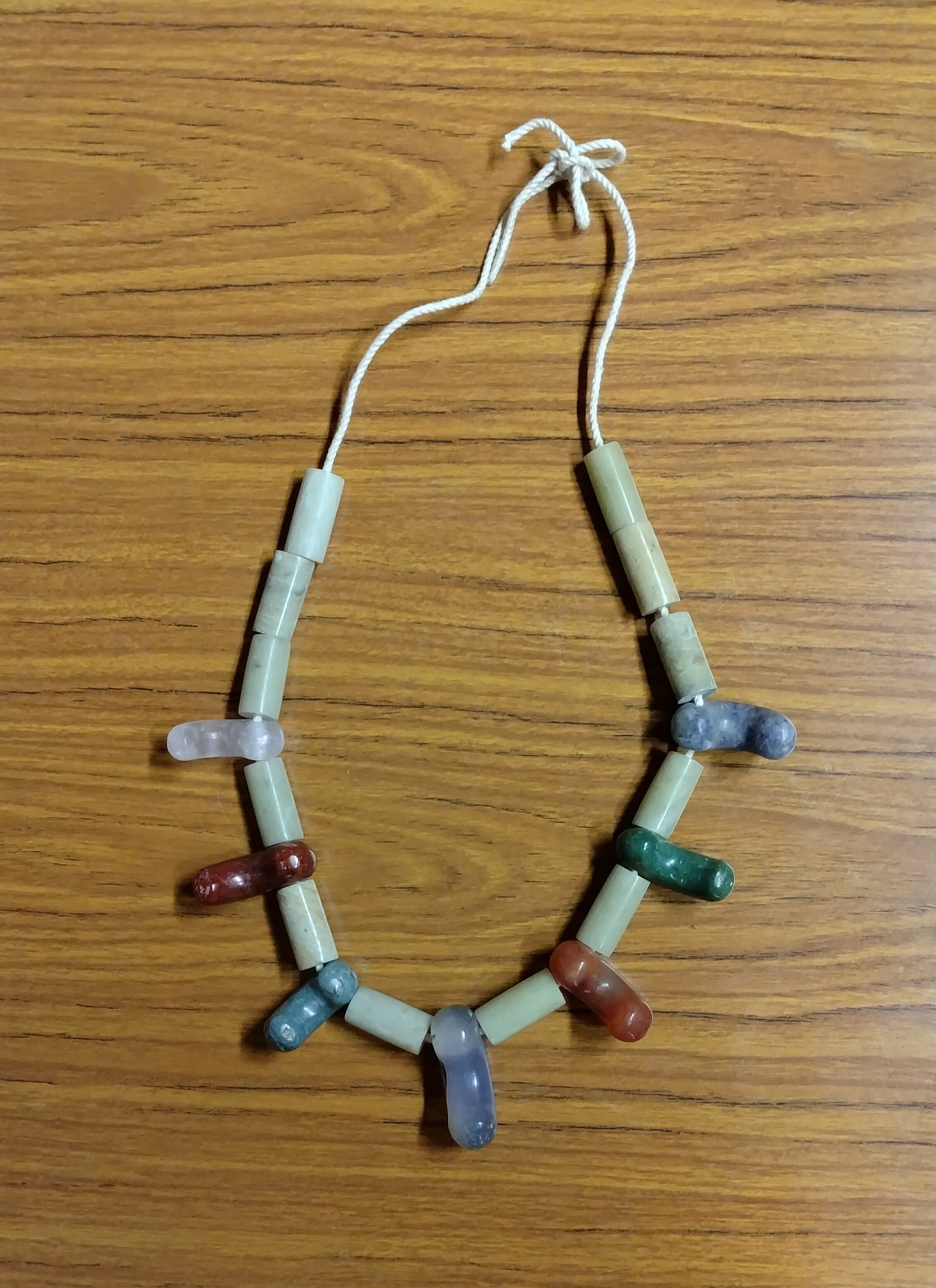 彼は、碧玉から水晶様々な石を実際に拾ってきては手磨きで勾玉を作製し、写真のような首飾りを完成させました。現代の玉造部といえるでしょう(恐らく、生まれてくる時代を間違えたのだと思います)。