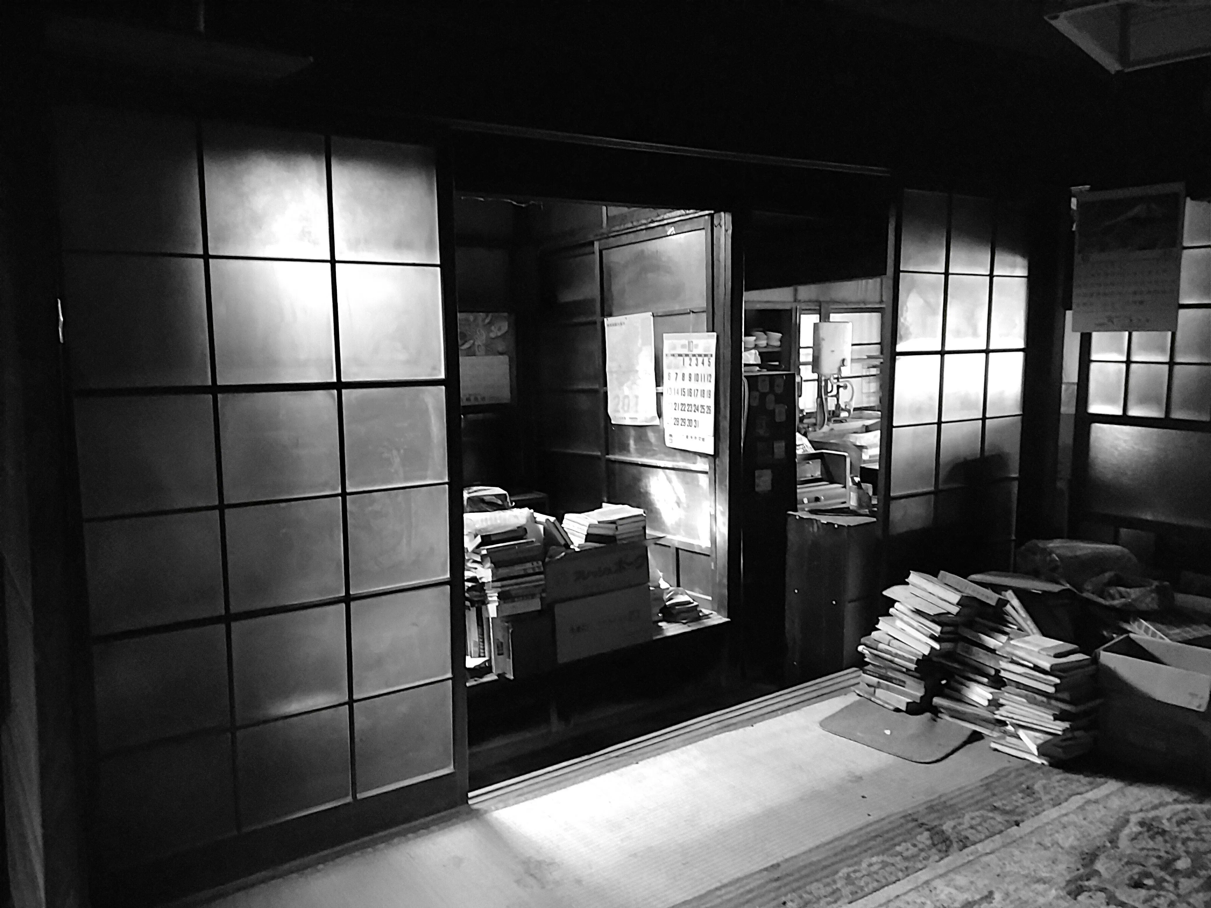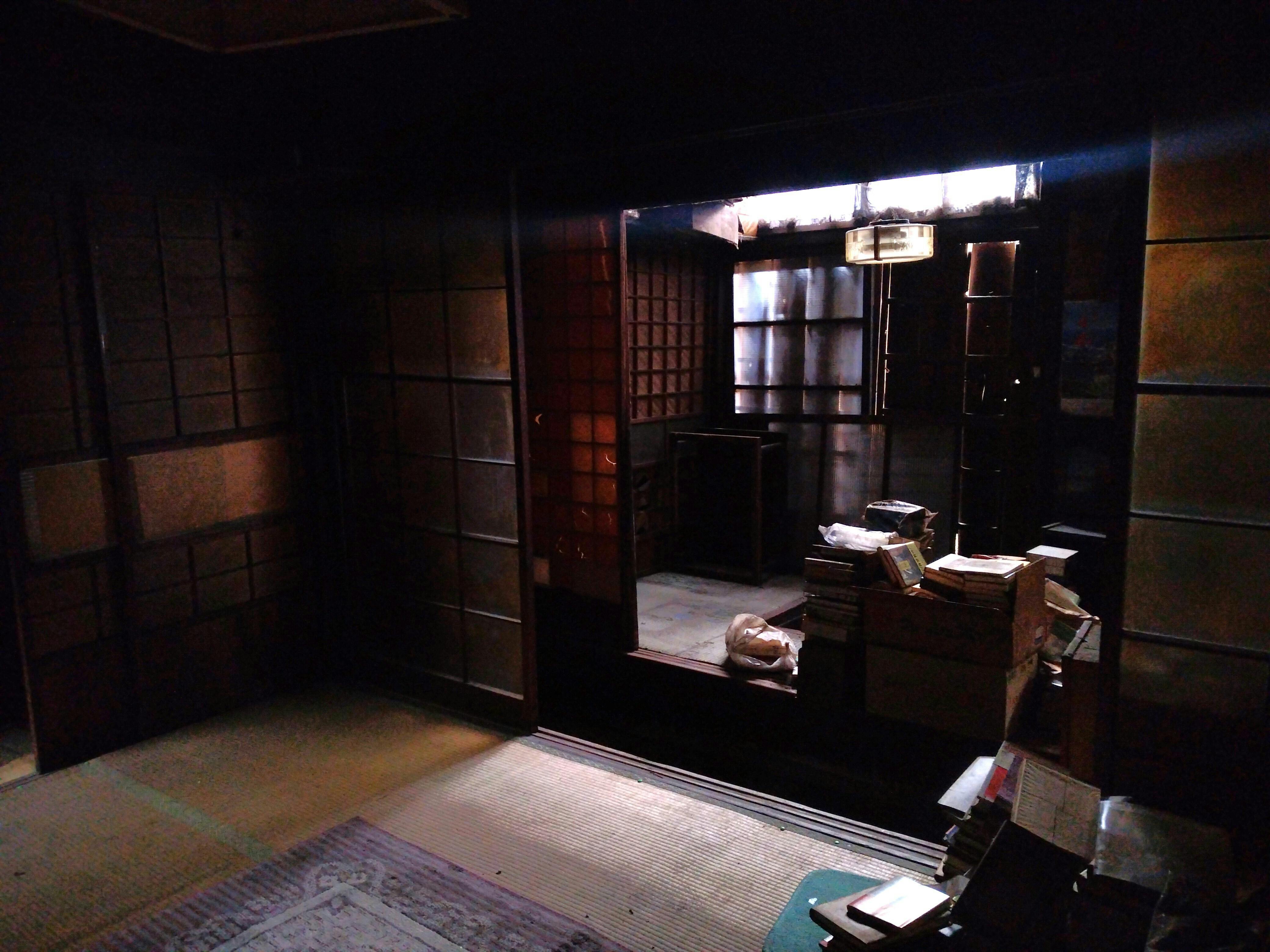 座敷は八畳、写真右に次の間が六畳あります。撮った写真の後ろ側には押し入れがあり、押し入れは取り外す予定です。そうすることで階段へは行きやすくなります。