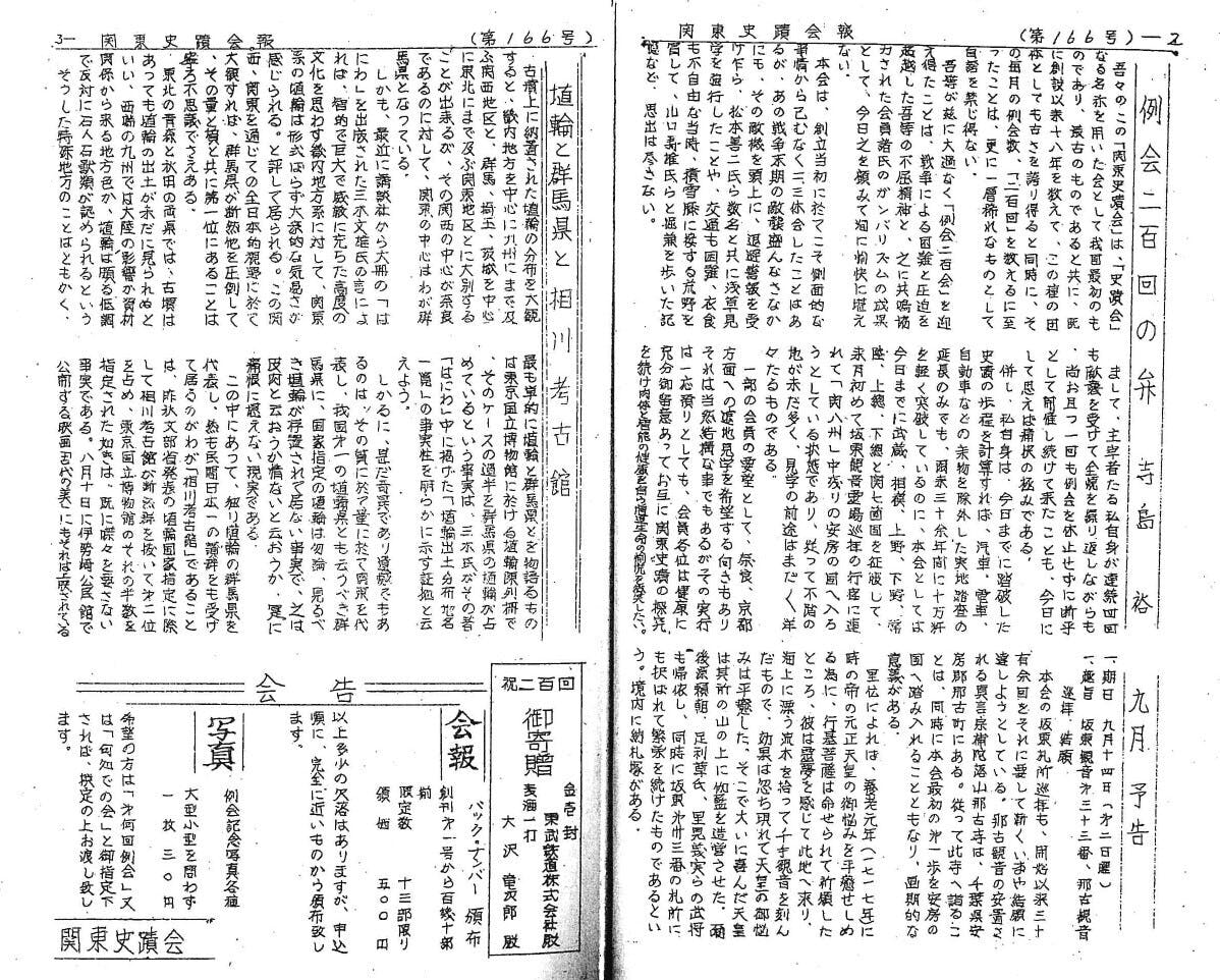 現在、相川考古館の活動の一つに史蹟会があります。もともとは赤城郷土会として毎月各地の史蹟を見学する活動していましたが、のちに武蔵史蹟会と合併し、関東史蹟会として活動を継続していました。平成8年に、関東史蹟会から現在の相川考古館史蹟会と名前が変わり、現在も活動を続けています。