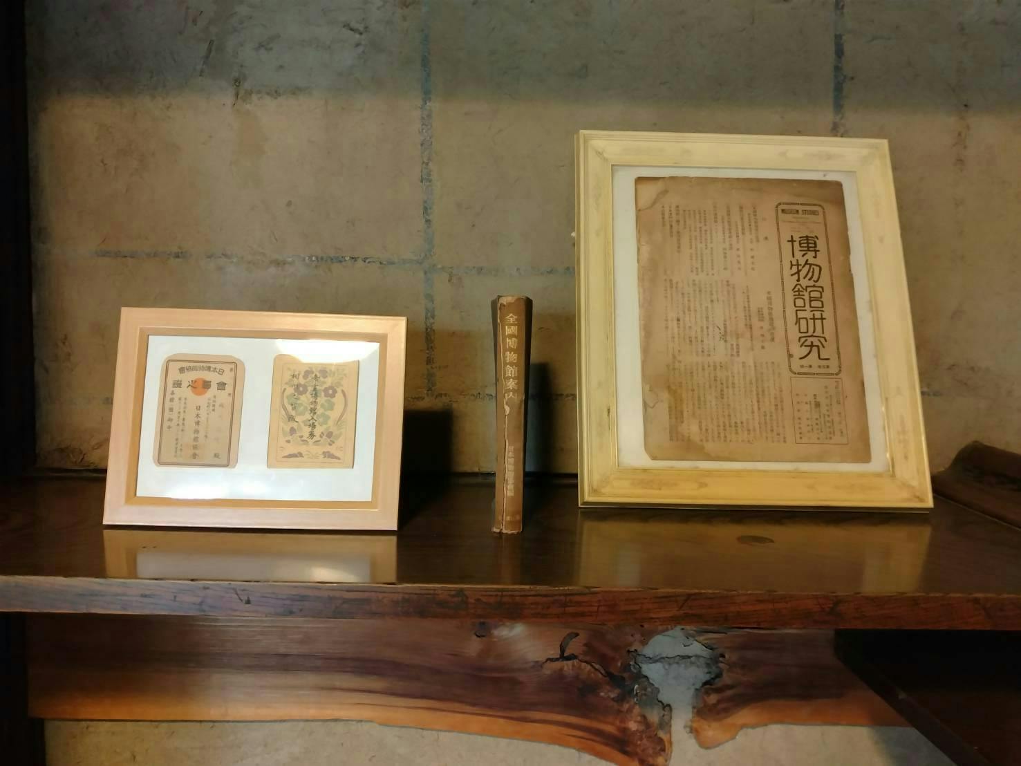 今回は、博物館らしく、日本博物館協会の初期資料(会員証、博物館研究no.1、全国博物館案内)を飾ってのお出迎えをさせて頂きました(協会にも無いかもしれないというレアものだそうです。100周年の時には、会員証を博物館研究の表紙にもしたいとのお話も頂きました)。