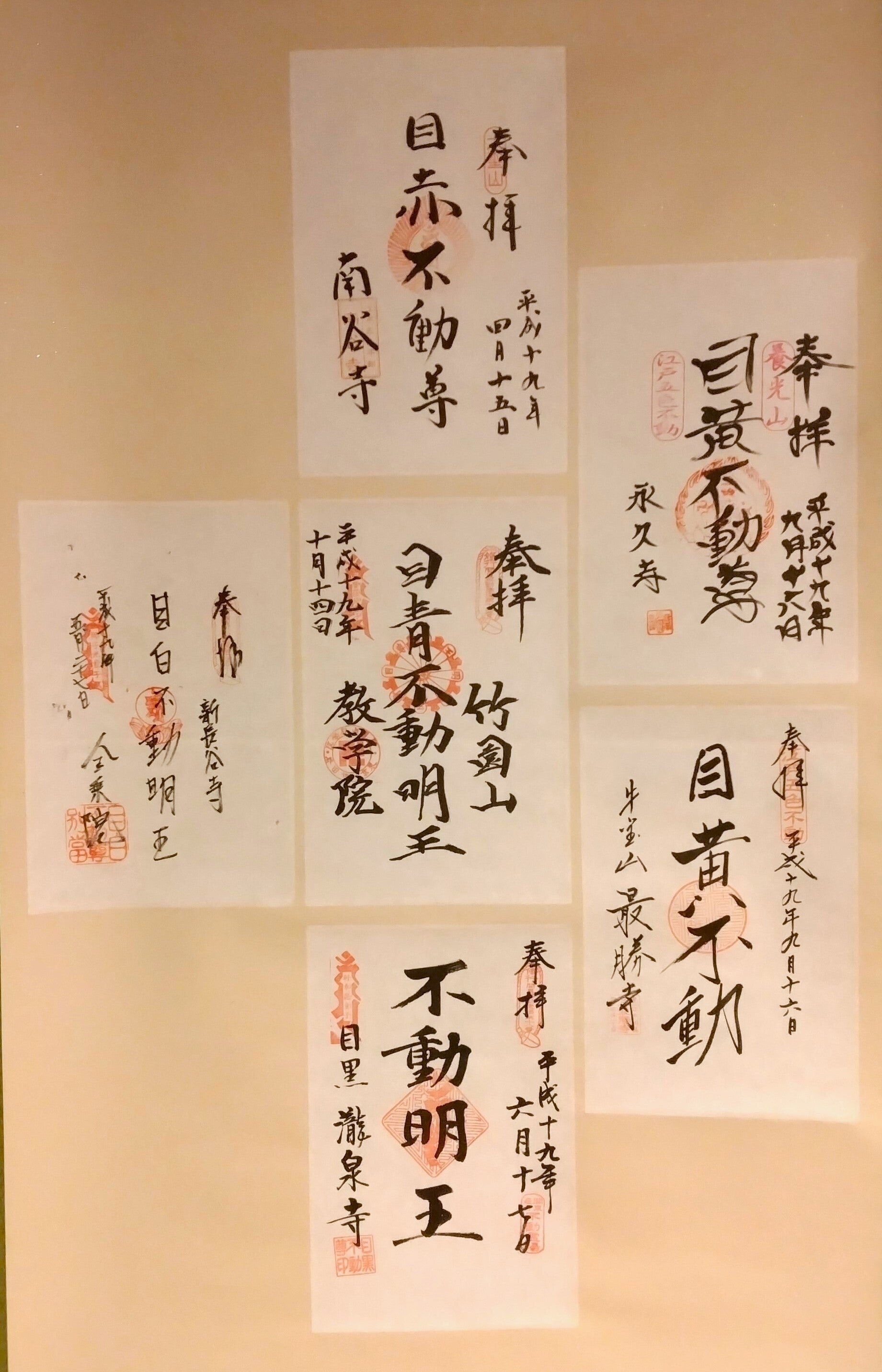 学祭で飾った五色不動の掛け軸平成19年4月15日の目赤不動から始まり、10月14日の目青不動まで、夏休みを抜いた5回の活動を行い、学祭にのぞんだ。懐かしさもあるが、今から18年前のことと考えると・・・・恐ろしい。