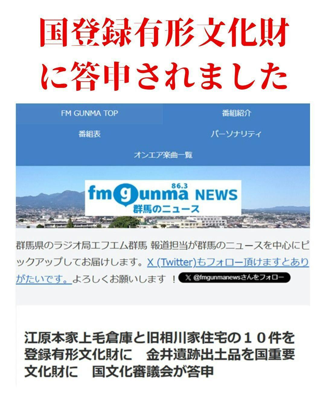 3月21日(金)夕刻、群馬県から一通のメールが届きました。「この度は国登録有形文化財の答申おめでとうございます。」答申・・・いわゆる会社でいう内定という意味あいになります。正式には官報の記載をもって決定になります。今答申は7月の官報に掲載される予定なので、7月をもって晴れて国登録有形文化財と呼んで問題ないということになります。相川家が国登録有形文化財になる建造物は全部で6件。 ①旧相川家住宅旧店舗(江戸時代後期) ②旧相川家住宅主屋(江戸時代 天保8年) ③旧相川家住宅土蔵(江戸時代 天保15年) ④旧相川家住宅稲荷社(明治15年) ⑤旧相川家住宅表門及び弊(明治時代) ⑥旧相川家住宅裏門及び弊(昭和初期)伊勢崎市内で文化財保有数が最多となる博物館になります。FMGUNMAのホームページの掲載内容は下記のようにつづきます。FM GUNMAのホームページhttps://www.fmgunma.com/fmgnews/?p=6573群馬県のホームページhttps://www.pref.gunma.jp/site/houdou/690742.html
