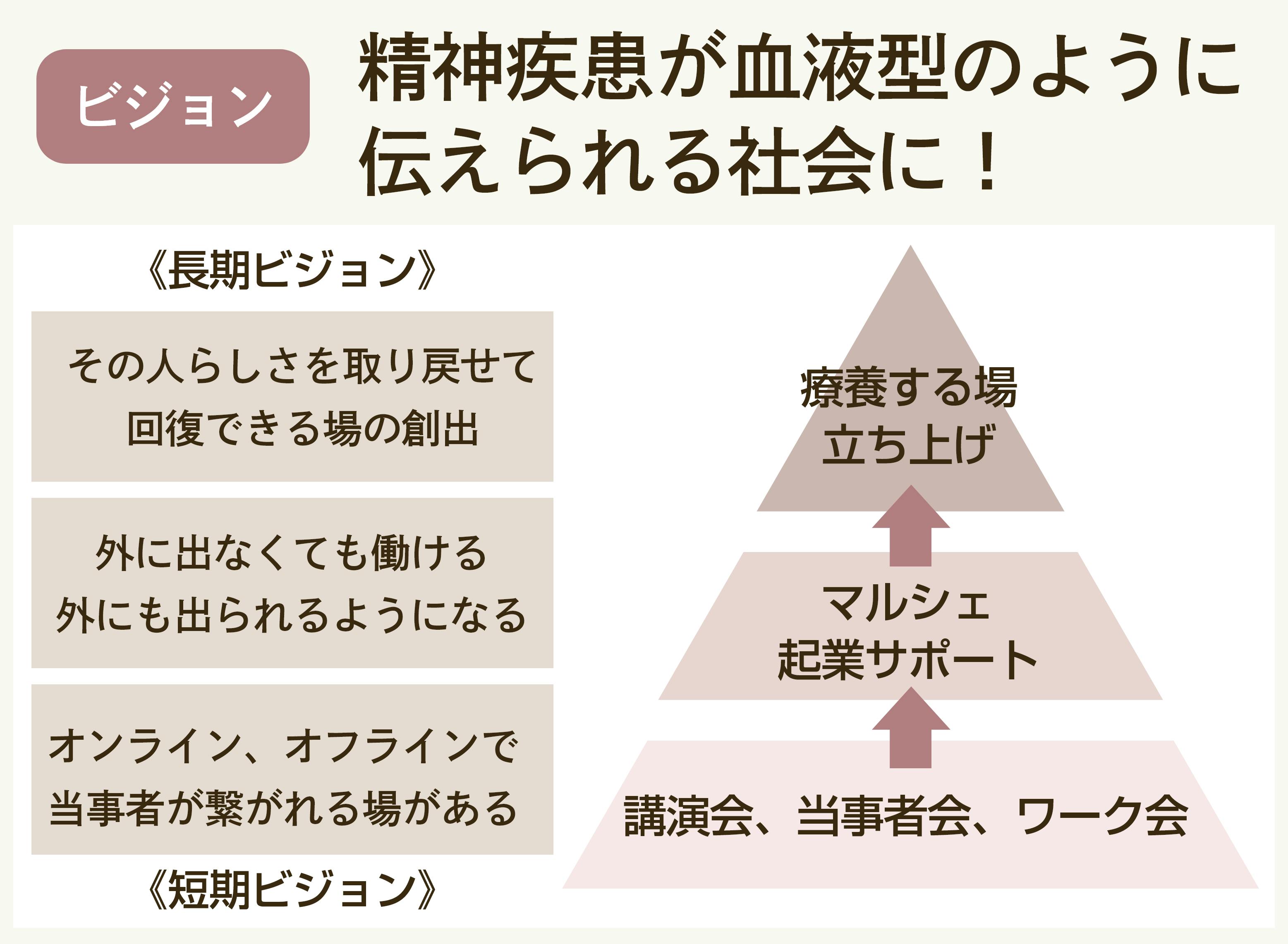 精神障害のことを、血液型と同じように伝えられる社会になって欲しいと願っています。特に「産前産後に支援を受けられる体制づくり」や「外で働けない方」をサポートするような体制を整え、メンタルの問題を気軽に伝える、相談できる場所づくりが必要です。