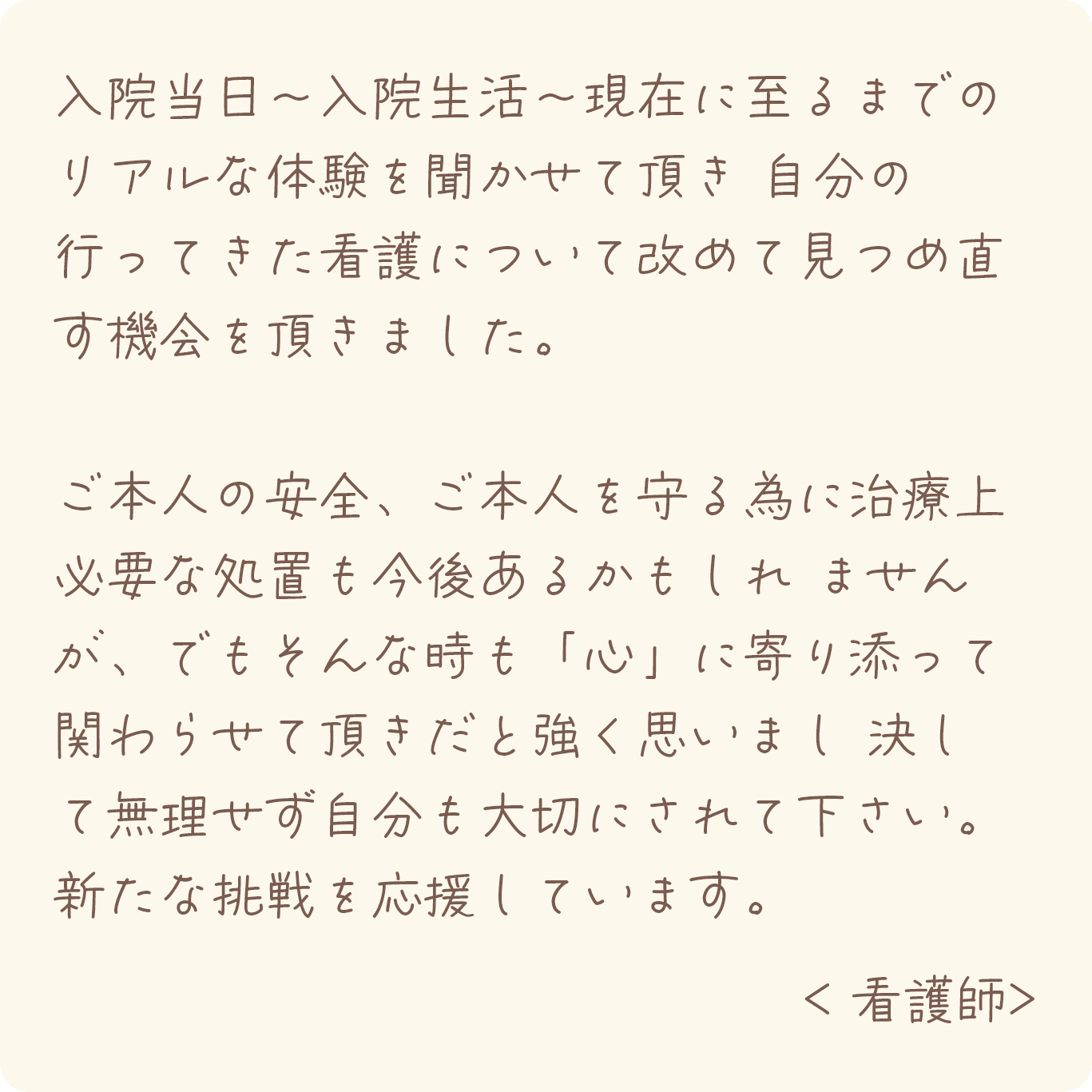 自由に自分の意思で自分の足で動けること、好きなときに食事を摂れること、時間が分かり安心して次の行動がとれること、思っていることを口に出せること、夜にしっかり寝れること。あたりまえのこと、日常の些細なことがかけがえのない幸せなのだと感じました。