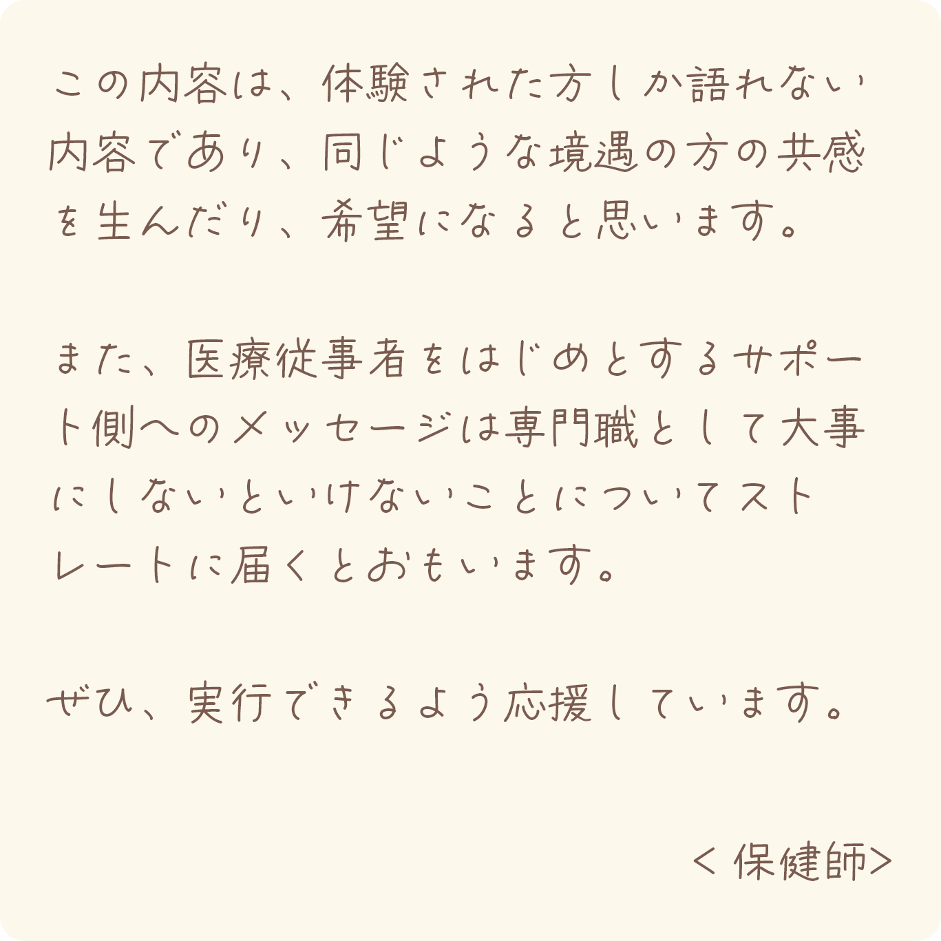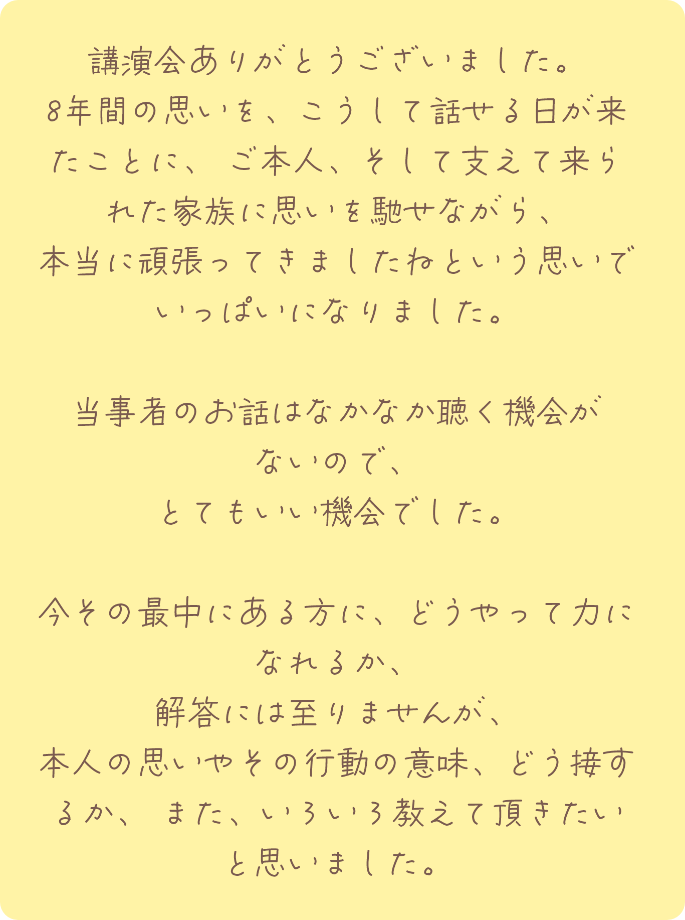 どうかその中で見えた光を、希望を、当事者が前向きに取り組める何かを。