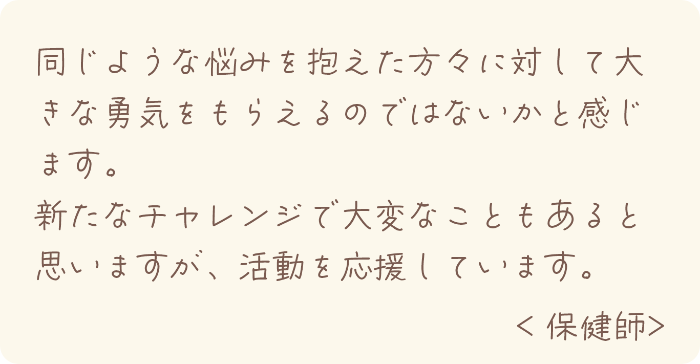 昨年の11月にオンライン講演会でお話させていただき当事者の方とお話する機会があり、講演会のあとにもメッセージをいただくようになりました。周囲には言えない悩みを抱えている方がたくさんいらっしゃることがわかりました。
