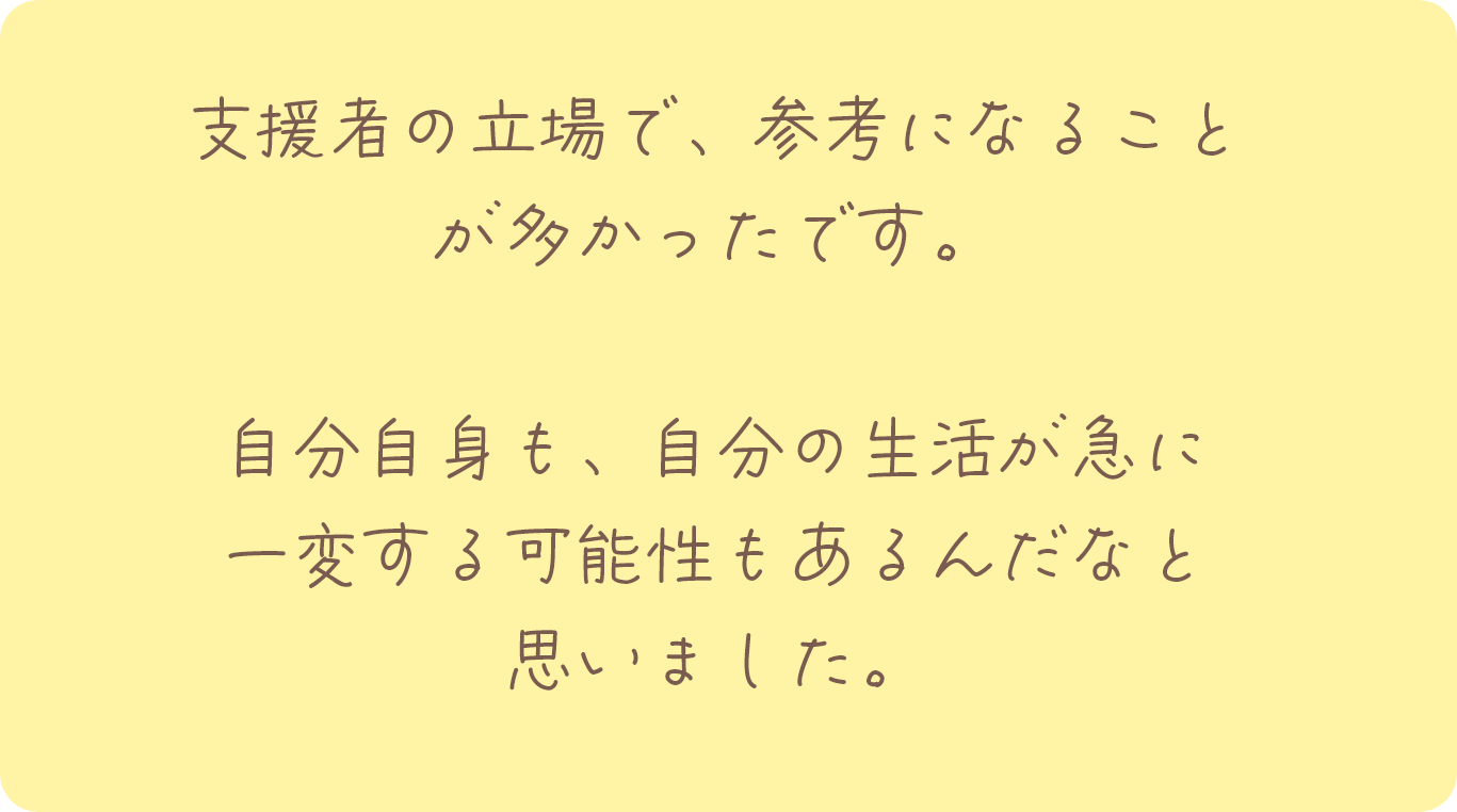 諦めずに自分にフィットする支援者を探すことの大切さも感じました。