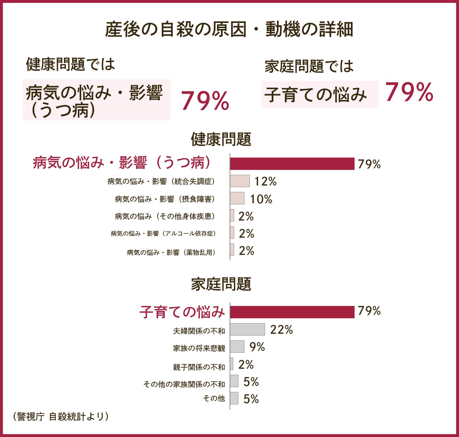 自殺された方の原因と動機は病気の影響や子育の悩みが最も大きな理由でした。「微笑みうつ病)」というような、メンタルは病んでいても、人前では笑顔で明るくふるまってしまう方もいるため、健康そうに見えても周囲は気づきにくいこともあります。