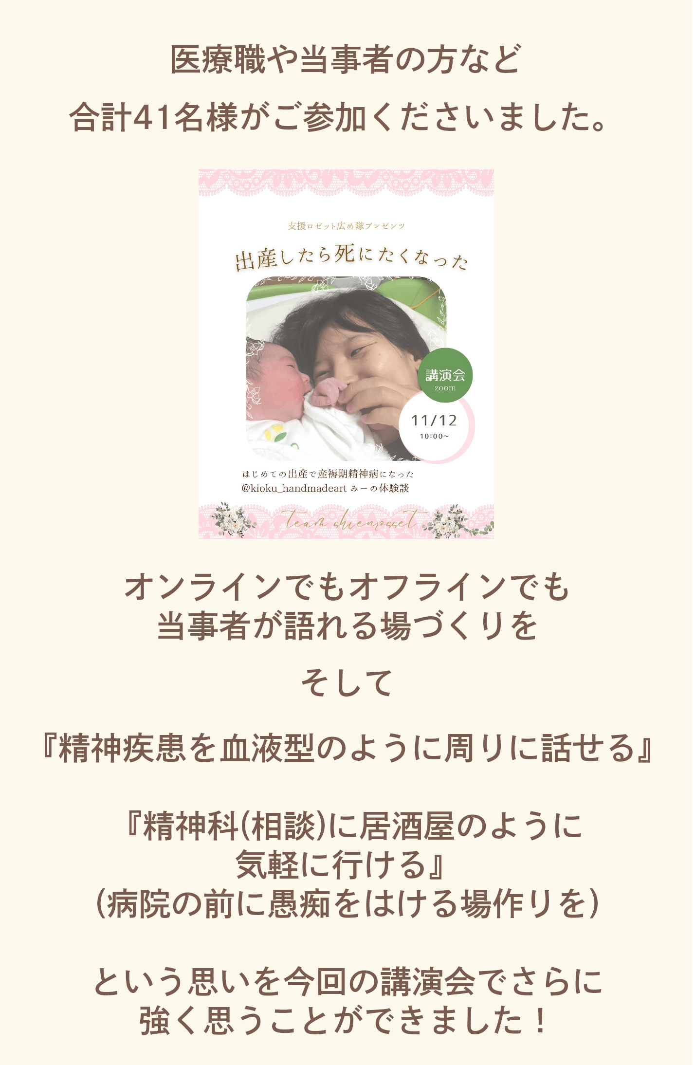 2025/03/29 19:54クラファン、90名の方にご支援いただき、約半分の53%達成でした!!応援ありがとうございました( ; ; )最後の日は親戚の家で部屋を借りていたので、バタバタと配信終わってしまいましたが、夜に急遽Liveに来てくれてマルシェも来てくれたうめあゆちゃん、そして最後までなつきさんとなおさんには配信にお付き合いいただき、沢山の皆様も応援に来てくださって本当にありがたかったです!!!そして、父からの反対もありましたが、応援してくれた家族、親戚にも本当に感謝です。クラファンは私にとってゴールではなくスタートです!!!!『見えない病気や障害が血液型のように伝えられる社会へ』言わなければ分からないこと、知らない社会、見えてこない課題も沢山あります。もっと認知され、温かな社会になるように、これからの活動も頑張ります!!一連の配信などお付き合い、シェア、拡散、ご支援等応援いただきありがとうございました(❁ᴗ͈ˬᴗ͈)そしてご支援いただきました皆様には順番にご連絡をさせていただきます!本当にありがとうございました!!!!クラファンページはまだご覧になっていただけます。産後苦しかった方、家族や身近な方を亡くした方、今病気や障害で生きづらさを感じていらっしゃる方、ぜひこちらのページやこれまでの活動報告も読んでいただきオープンチャットにもご参加いただけますと嬉しいです!⭐︎次回4/22に第二回目のzoom当事者会を開催予定です!これからも活動報告は行って参ります!今後ともどうぞよろしくお願いいたします! もっと見る