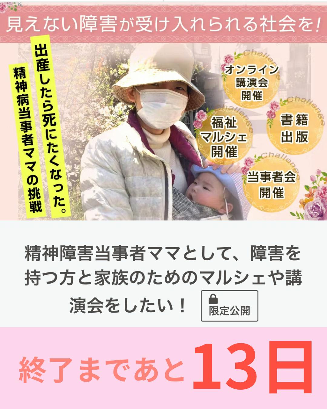 【クラファン終了まで残り2週間を切りました!!】皆様クラウドファンディングのご支援、またSNSなどでのシェア拡散、お気に入り登録など本当にありがとうございます!(❁ᴗ͈ˬᴗ͈)2/4にスタートして、これまで述べ40名の方にご支援していただき、目標の29%を達成しました!また2月末には@team.shien_rosette主催でのzoom当事者会をさせていただき、その後もdmをいただいたり、次回開催のリクエストもいただいたりしております!当事者のオープンチャットにてイベントのご案内や交流を図っています!※当事者であれば参加ok,匿名でご参加できます。オープンチャット「当事者会チャット〜精神障害、発達障害、知的障害、身体障害、見えない障害や病気の方へ〜」https://line.me/ti/g2/okFhj61nebvvYvp0zLZyJUKA-82pkRHJklddrQ?utm_source=invitation&utm_medium=link_copy&utm_campaign=default当事者の方はもちろんご家族の方にもぜひシェアなどしていただけますと幸いです!今週は毎日liveなどもさせていただきながらマルシェの準備をしております!また、チラシの作成の為スポンサーにご支援いただきました皆様にはメッセージをお送りしております。火曜日まで〆でスポンサーの方々には今回のチラシにも掲載させていただきますので、こちら応援いただけますと幸いです!また、沢山の方にご協力いただきコラボリターンも追加しております!ぜひそちらもご覧いただけますと嬉しいです!引き続き活動報告もして参りますので、応援よろしくお願いいたします!!