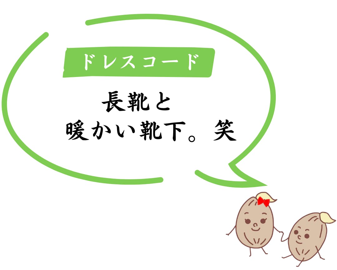 ドレスコードは、「長靴と暖かい靴下」。笑