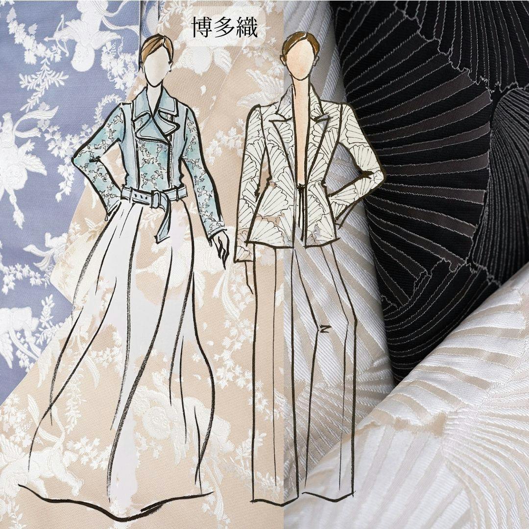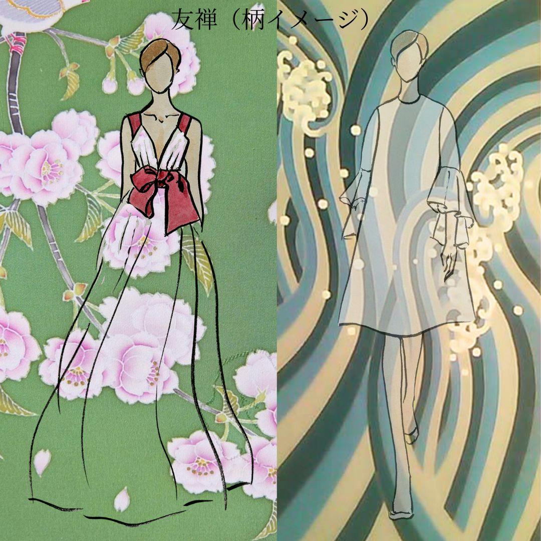 ■友禅(手書き&デジタル)の生地でイブニング、カクテルドレスを。特にデジタル友禅の生地では、MA-1ジャケット、シャツ、ワンピースなどカジュアルなアイテムを。
