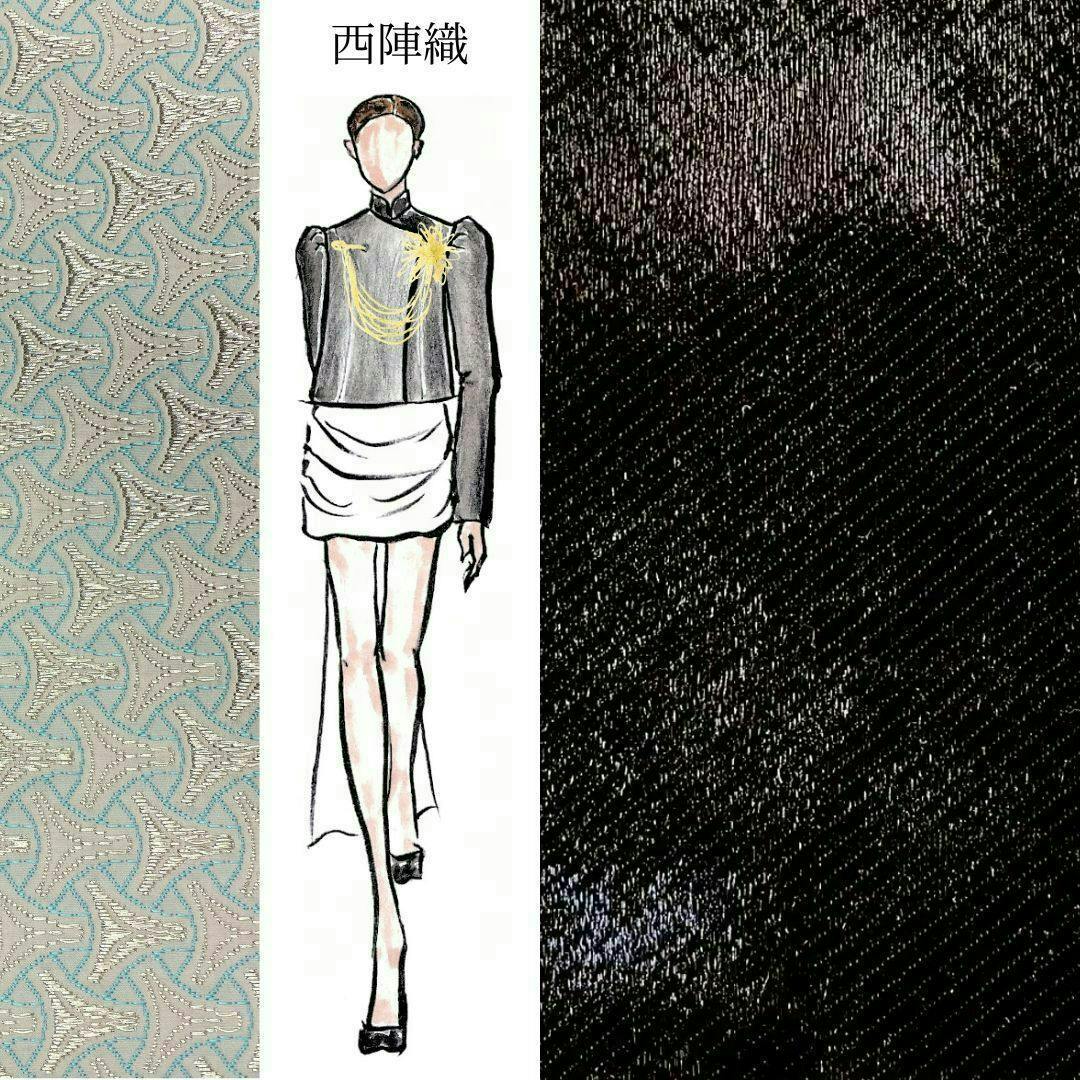 ■西陣織ならではのゴージャスな柄帯生地や、濡れたような独特の光沢感を放つ、黒金糸をふんだんに織り込んだ黒生地(プロジェクトのためにオリジナルで企画開発)を使ったジャケット。水引のモチーフと金糸のガーランドをあしらった大きなピンで前見頃を留めます。