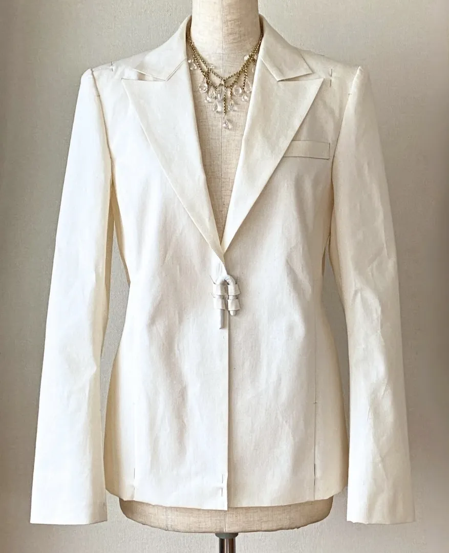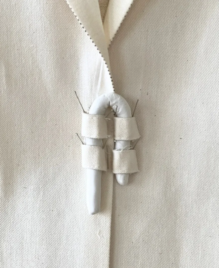 留め具は前見頃の裏にタブを付け、チェーンで付け外しできるように(落とさないため)、また留め具単体でも、ペンダントトップやチャームとして楽しめる仕様にします。