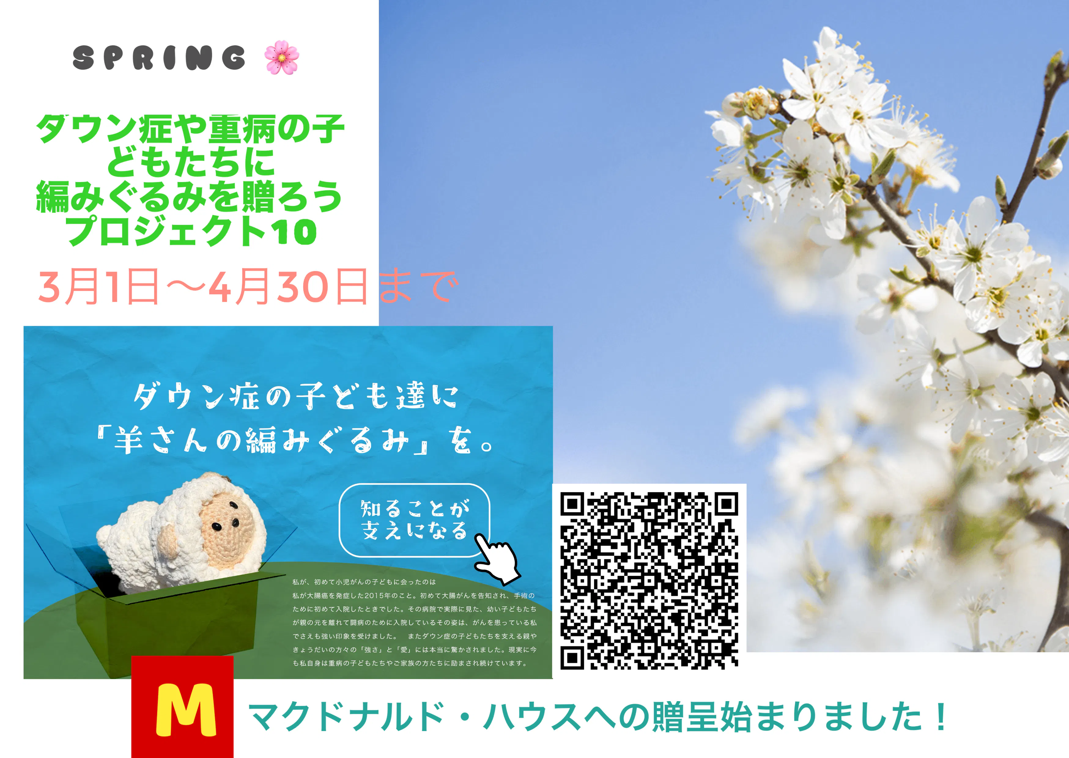 3月4月の「ダウン症のや重病の子どもたちに編みぐるみを贈ろうプロジェクト10」を開始いたしました。