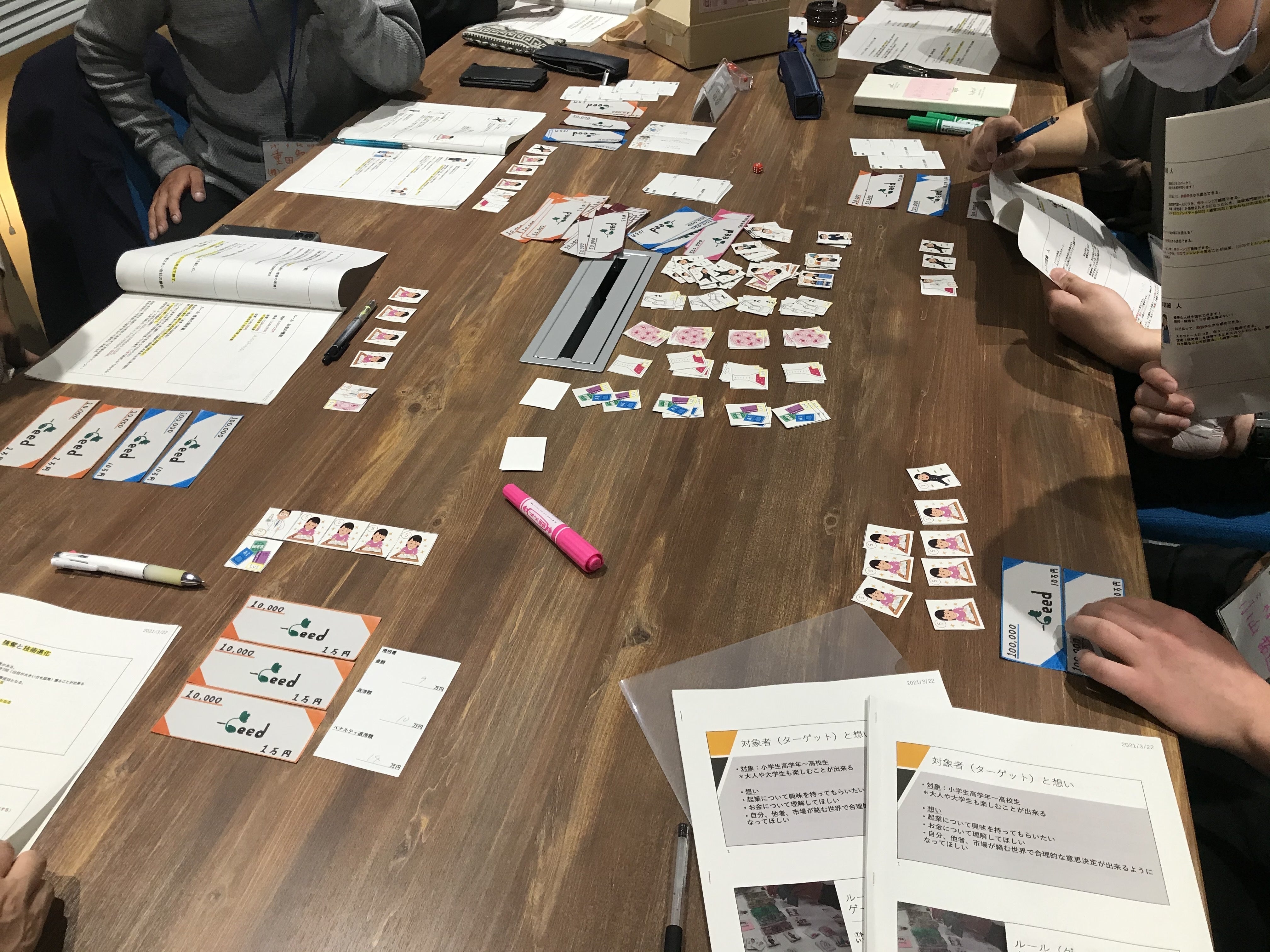実際に起業している方やベンチャーを立ち上げた方にヒヤリングを行い、ルールを作って提案しては修正を繰り返す日々を重ねました。さらに、ゲームとしてそもそも面白くなくては意味がありません。そこでボードゲーム愛好家や学生、小学生の親子の方々にもテストプレイに参加していただき、何度もルールの改良を行ってきました。