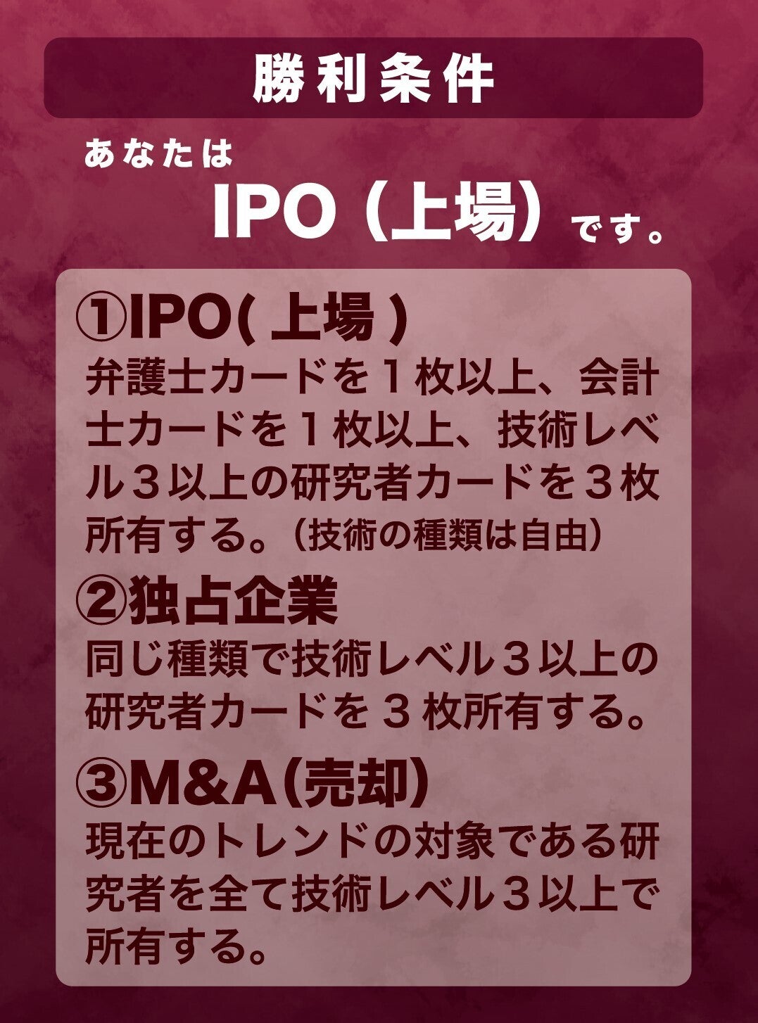 →起業家の目標は人それぞれです。上場を目指す者や、会社を高値で売却して巨額の財を手にしたい者、一つの分野に特化して社会貢献に尽力したい者など。本ゲームでは多様にある起業家たちのゴールを再現しました。