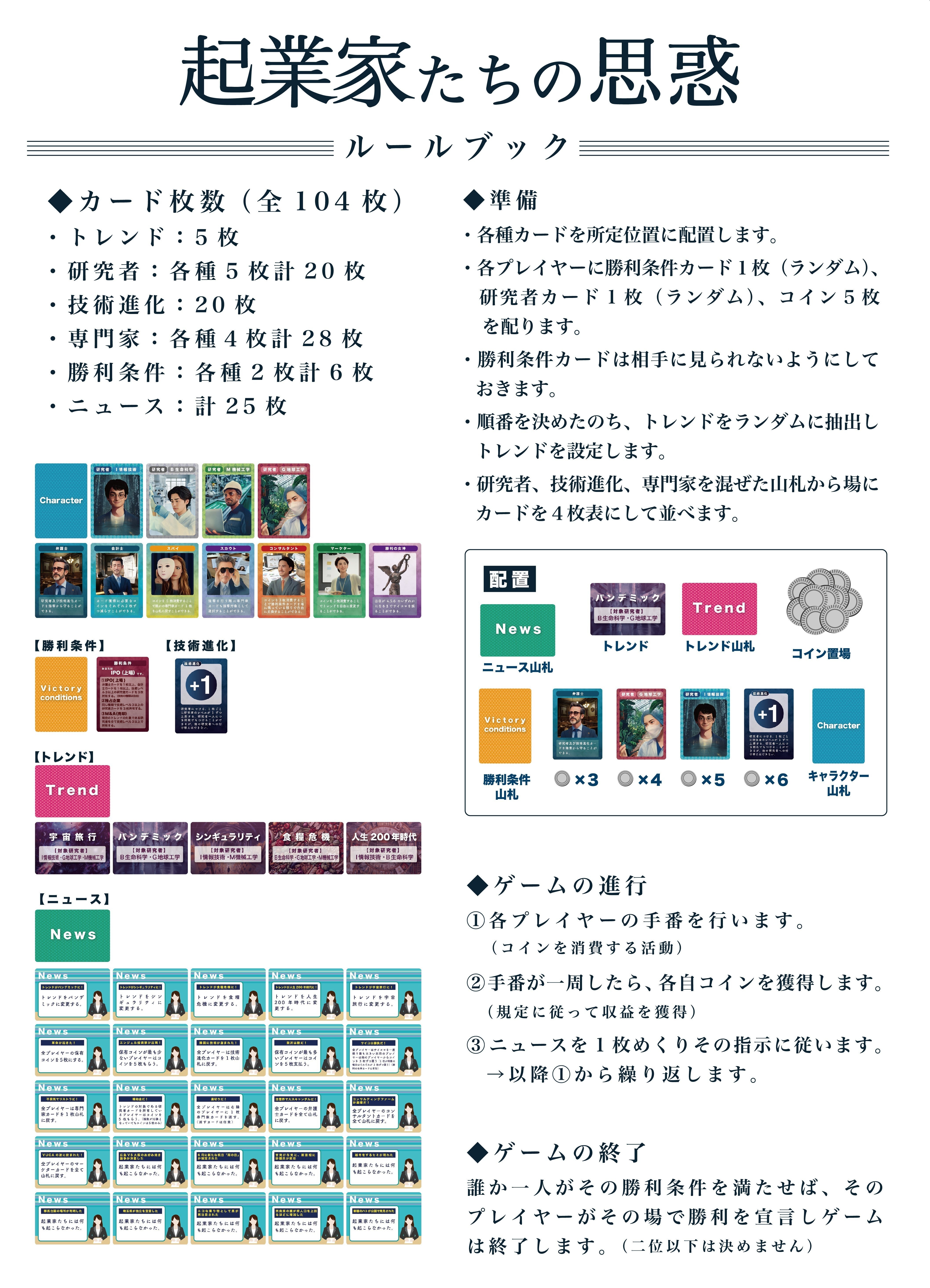 ※個人的な話ですが、ルールブックの作成やカードの文言を決める作業などゲーム本体を作る作業よりはるかに労力がかかっています!物自体は予算の都合で味気ない小冊子ですが、文章には力を入れました。筆者本人としてはゲームを遊んでもらうことより小冊子を読んでもらう方が嬉しいといっても過言ではありません!
