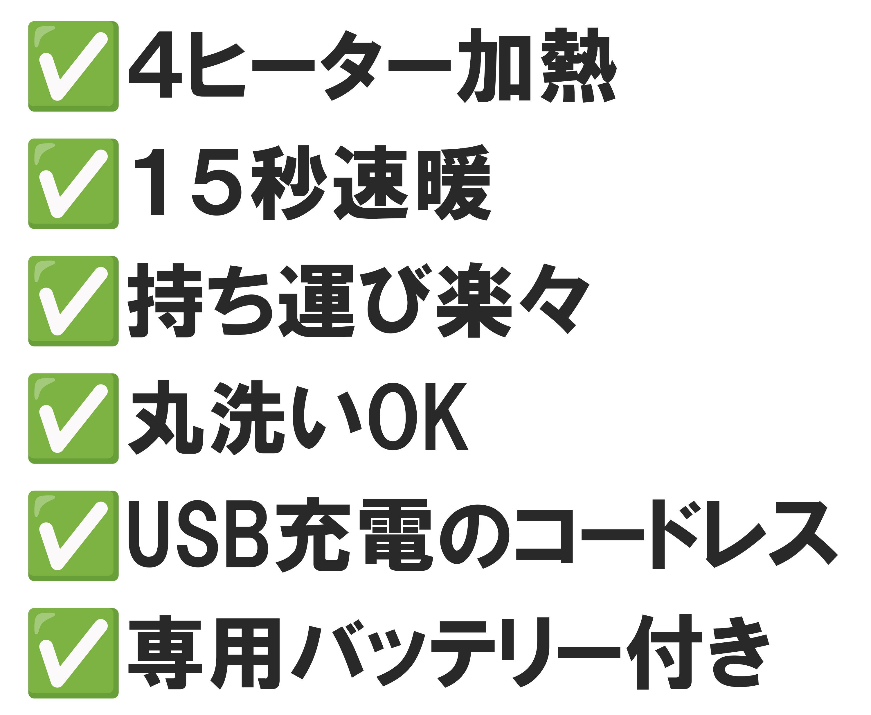 大容量バッテリーだから45℃設定で5時間半加熱し続けます。※当社実験結果