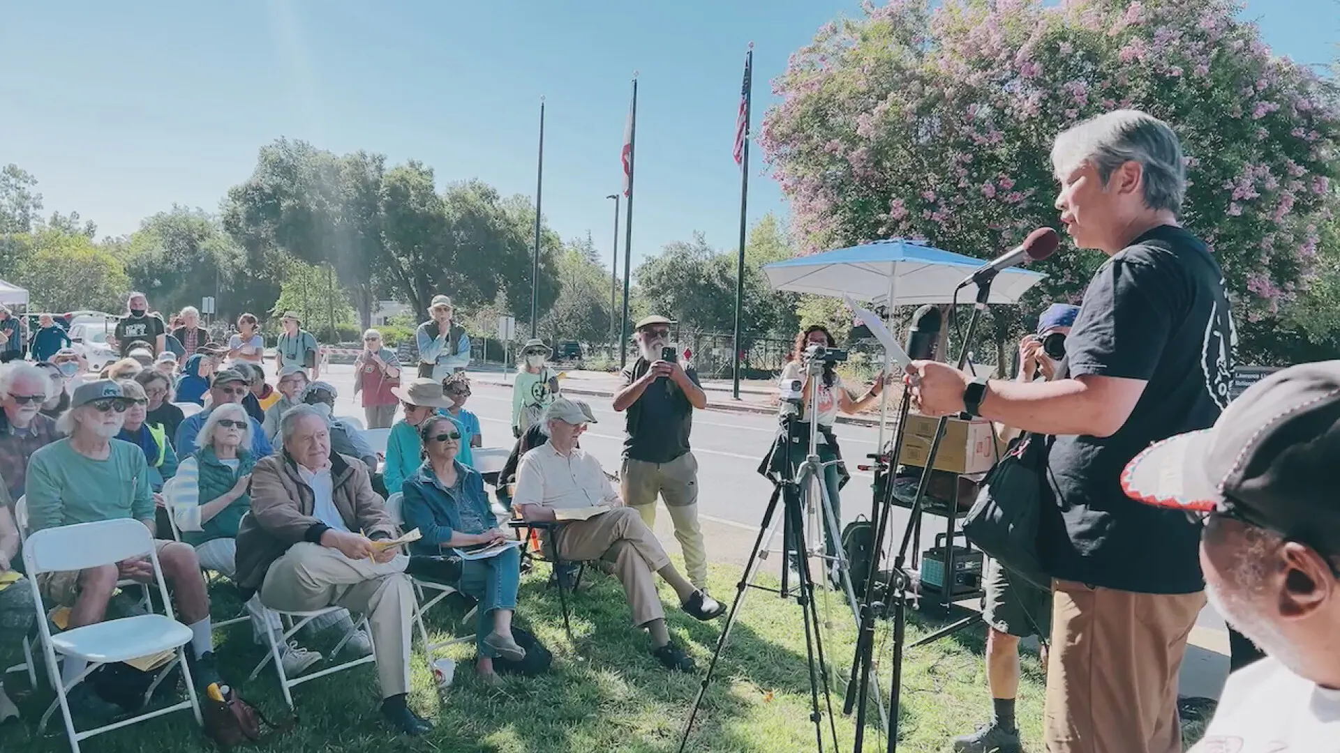 2025年、ローレンス・リバモア研究所で行われた反対集会に参加した自分の思いを参加者に伝えた