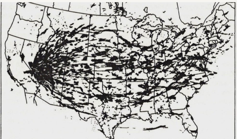 この地図は、1951年からアメリカ国内で行われたちょうど100回の地上での核実験(地下では828回)による放射性物質の広がりを示す図だ