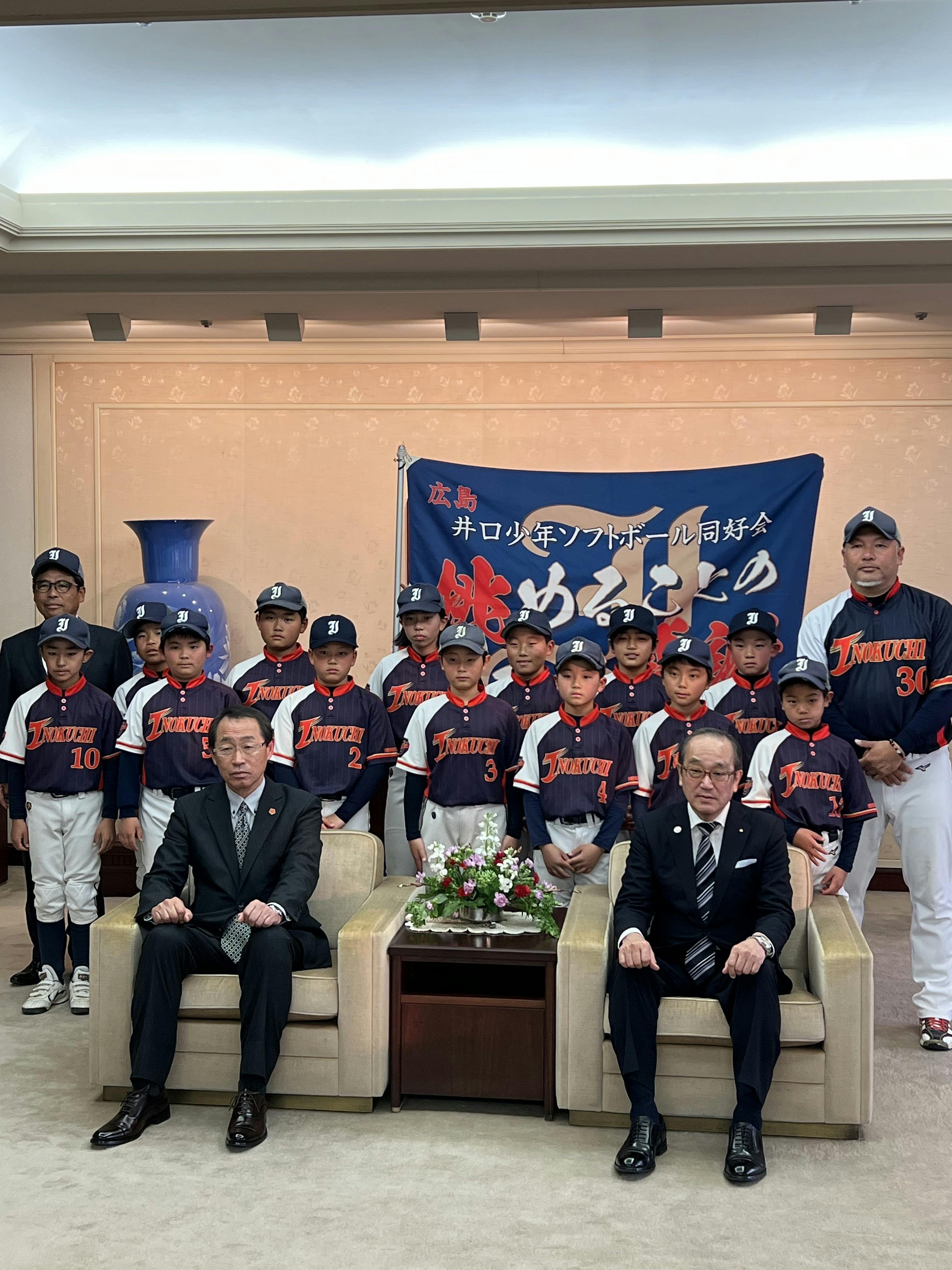 令和7年1月23日に、私たち井口少年ソフトボール同好会は、「第18回春季全日本小学生ソフトボール大会」への出場をご報告するため、江波体協少年ソフトボールクラブ若竹会の皆さんと一緒に広島市役所を訪問し、松井市長にお会いしました。