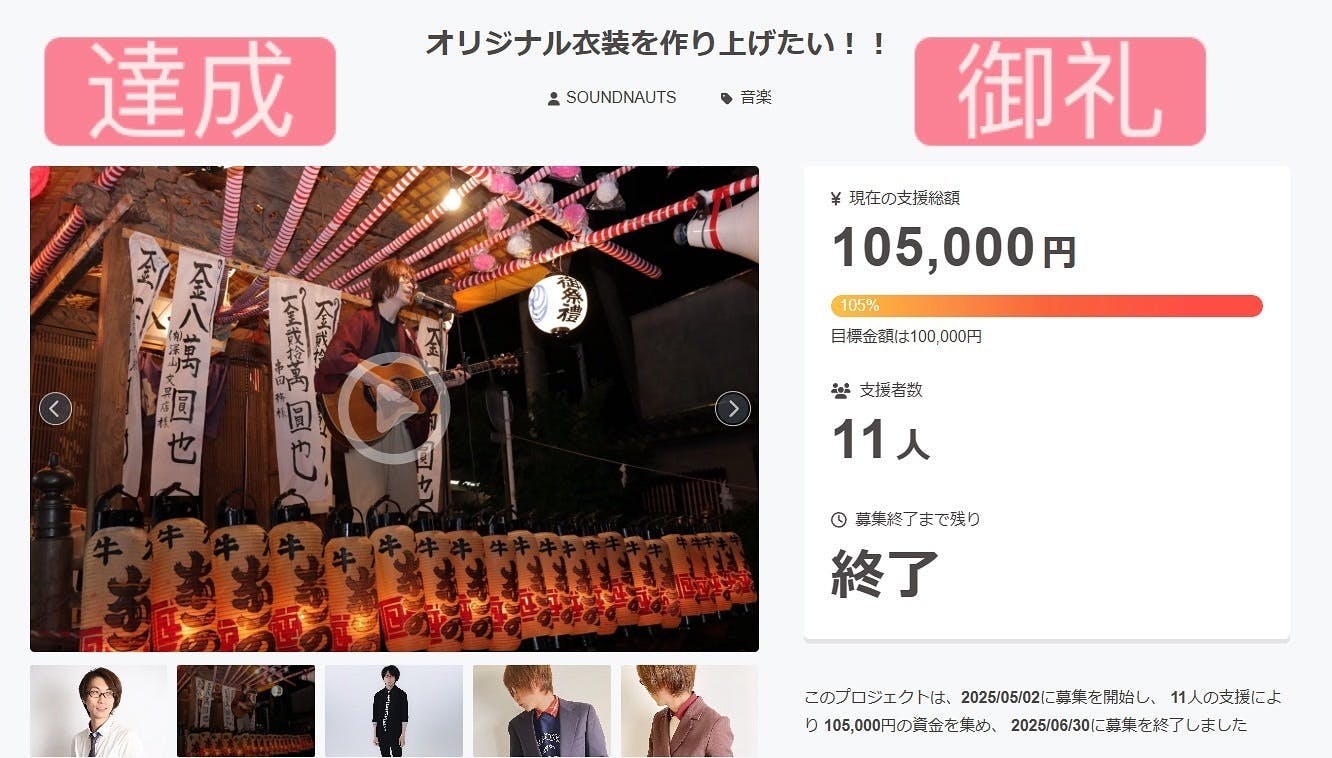 2025/06/16 18:24日頃からこのプロジェクトを閲覧・ご支援等で【活動報告】にも目を通してくださりありがとうございます。皆様から頂戴したお力添えのおかげで6月14日の夜に目標額を達成いたしました!!これまで長期間のお力添えいただきまして誠にありがとうございます!!このご支援によって皆様のパワーが衣装に宿ります!!目標額を達成できた【御礼】をここに述べさせていただきます…ありがとうございます!!小倉奨一朗 もっと見る