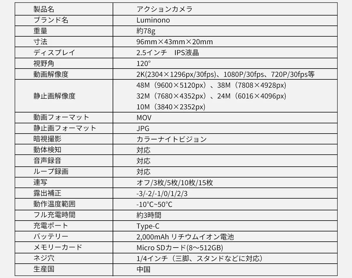本製品は、2K(2304×1296px)の高解像度動画撮影と、48MP(9600×5120px)の超高解像度静止画撮影に対応しています。
