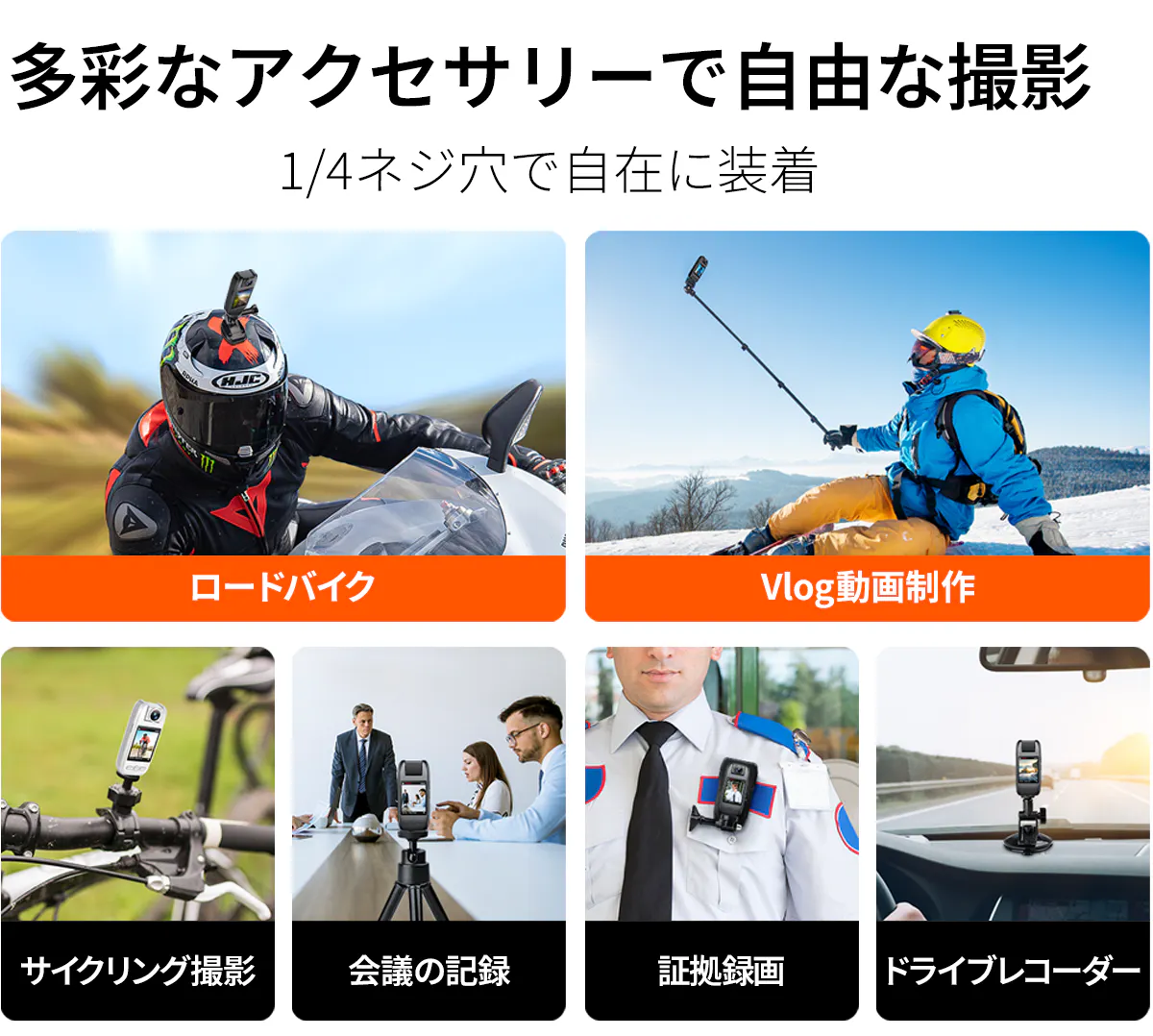 従来の固定型カメラでは難しかった、複雑なアングルや動きのあるシーンでも、ストレスなく撮影が可能です。例えば、胸元やヘルメットに装着すれば、自分の目線映像や周囲の景色を正確に記録できます。