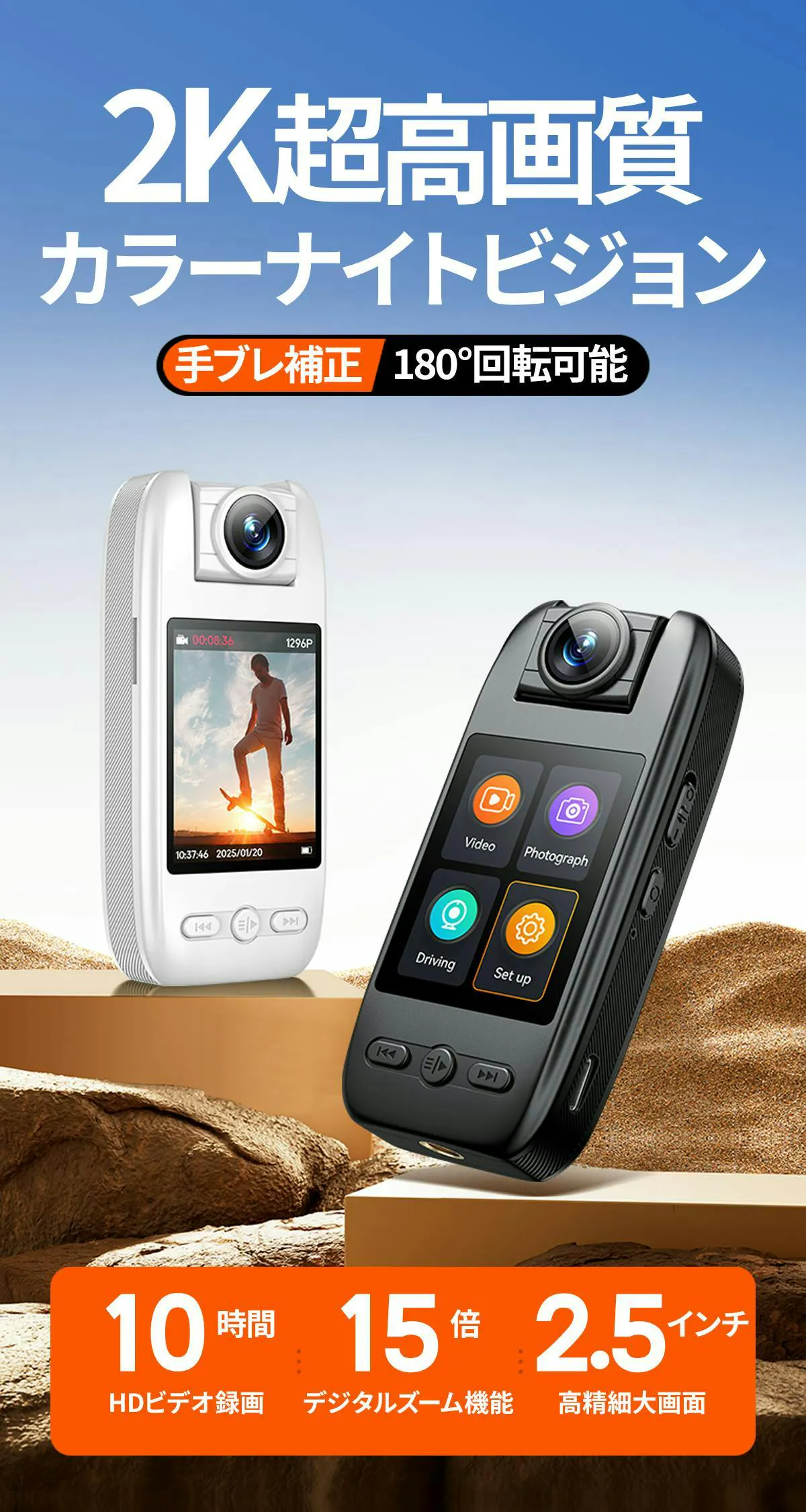 本製品は、画期的な180度回転式レンズを採用しており、想像以上の柔軟性と使いやすさを提供します。レンズの角度を自由に調整できるため、被写体に合わせて撮影方向を瞬時に変更可能。