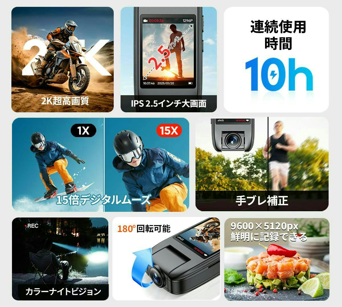 一般的なカメラが2~3時間程度の撮影しかできないのに対し、本製品は最大10時間の連続撮影が可能です。イベント、旅行、スポーツ観戦など、長時間の撮影を必要とするシーンでもバッテリー切れの心配はありません。