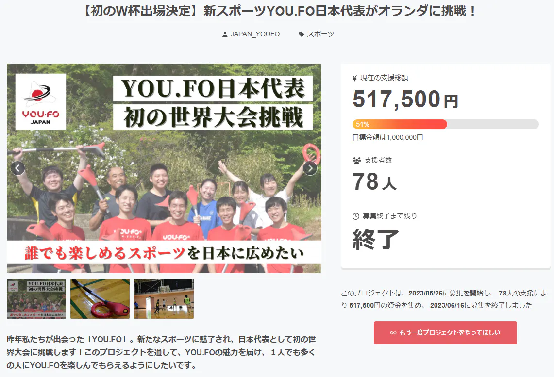 2025/07/22 22:07YOU.FOクラウドファンディング、そして『YOU.FO Ringcross World Cup 2025』が無事に終了いたしました。クラウドファンディングでは、目標を達成することができ、多くの方にご支援・応援をいただきました。改めて、心より感謝申し上げます。また7月20日・21日に開催されたワールドカップには、世界8か国・約120名の選手が参加し、国や世代、競技経験を超えて、YOU.FOの魅力が溢れる2日間となりました。大会の様子については、以下のプレスリリースにてご報告しております。ぜひご覧いただけましたら幸いです。世界8か国・25チームが集結!YOU.FOワールドカップ2025が東京・墨田で開催【リターンについて】現在、順次リターンの準備を進めております。楽しみにお待ちいただけますと幸いです。【これからが本当のスタート】今回の大会やクラウドファンディングの達成は、ゴールではなく一つの通過点です。YOU.FOは、まだ日本では生まれたばかりの新しいスポーツです。今回の取り組みをきっかけに、より多くの方にこのスポーツを「知ってもらい」「体験してもらい」「楽しんでもらう」場を広げていきたいと考えています。今後も競技の普及と発展に力を尽くしてまいりますので、引き続き温かく見守っていただけましたら幸いです。改めて、本クラウドファンディングを応援いただきありがとうございました。 もっと見る