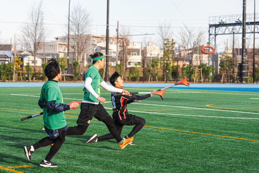 基本的なルールは、専用のスティックとリングを使い、決められたエリアでリングをキャッチすることで得点を取ることができ、その得点を競い合います。試合の人数は、3対3、4対4、5対5などがあり、チーム編成の性別制限は特にありません。試合時間は10分間1本勝負や前後半で7分ずつなど、試合によって決められます。
