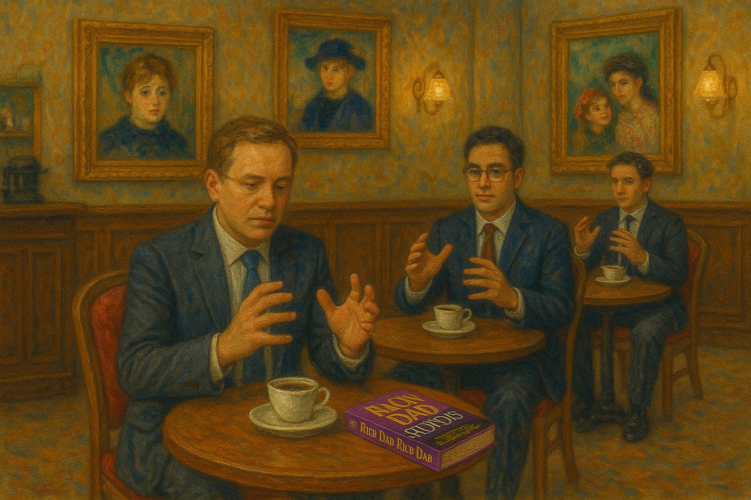 人生の先輩が各テーブルで待っている喫茶店です。壁にはルノワールの名画が飾られています。