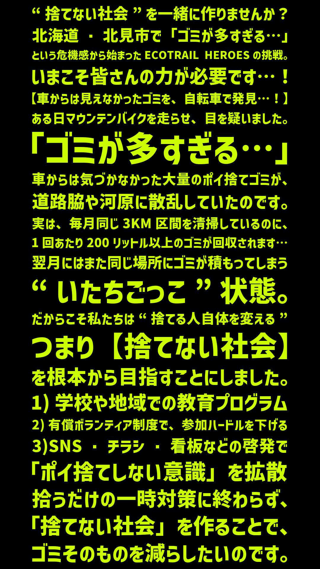 • 継続的な清掃やイベント運営: 北見市内から北海道全域、そして日本各地へと“捨てない社会”を波及させる。