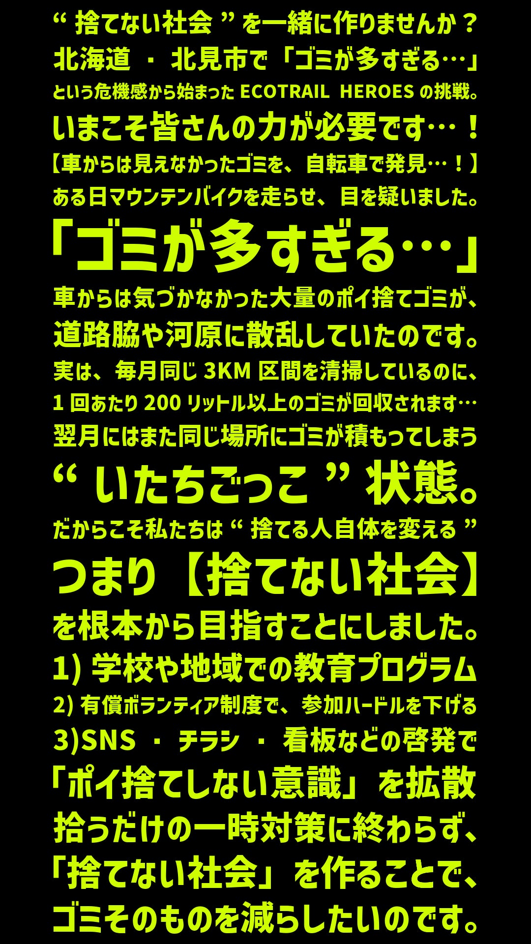 雪解けとともに、大量のポイ捨てゴミが顔を出す季節。このタイミングを逃さず、一斉清掃で街をきれいにしたい——それが今回のクラウドファンディング最大の目的です。