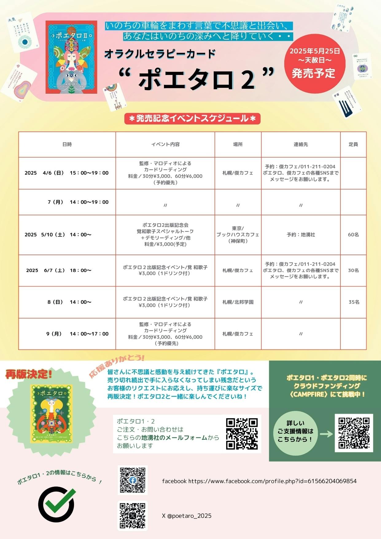 悩みというものは、人によって同じ内容でも重さが異なりますね。どうしよう、どうしたら…と、迷路にハマってしまって堂々巡り、なかなか抜け出せずにいるなんてこと、ありますよね。[ポエタロ]は、そんなときに引くと、何かしらのメッセージを届けてくれることが多いようです。覚和歌子さんに届いた、相談内容に対してのカードのメッセージをいくつかご紹介します。とある、恋人と別れようかどうしようか‥と迷っていた女性が「妖精」のカードを引きました。詩文は「もう大丈夫 そう言い残して」。本人も、「だったらもう潮時かな」と思いながら2枚目を引くと、「風」が出ました。「そよ風は心にすき間をくれる 音楽を満たすための」お相手は指揮者の方でした。とある女性は「幽霊」を引きました。詩文は「気づいてほしい 私ここにいる」その方は、8年前にだんなさんを大腸がんで亡くしていました。そしてそのカードを引いたのは、亡き夫の命日でした。前にも書きましたが、私も「谷川俊太郎さんにまた会いたいな」そう思ってカードを引いたら、「幽霊」が出ました。近々、またエピソードをご紹介しますね。さてさて、そしてお待ちかね[ポエタロⅡ]も、着々と完成に向かっています!そちらも近日、詳しくお伝えいたします。どうぞ楽しみにお待ちいただけたら嬉しいです。古川奈央でした。