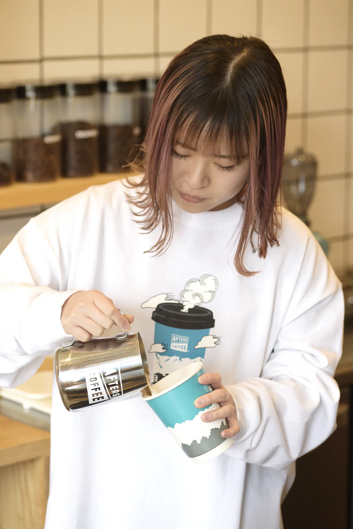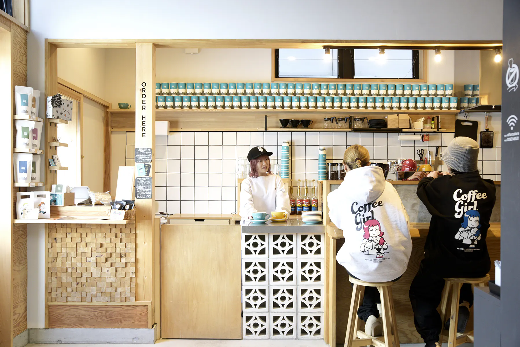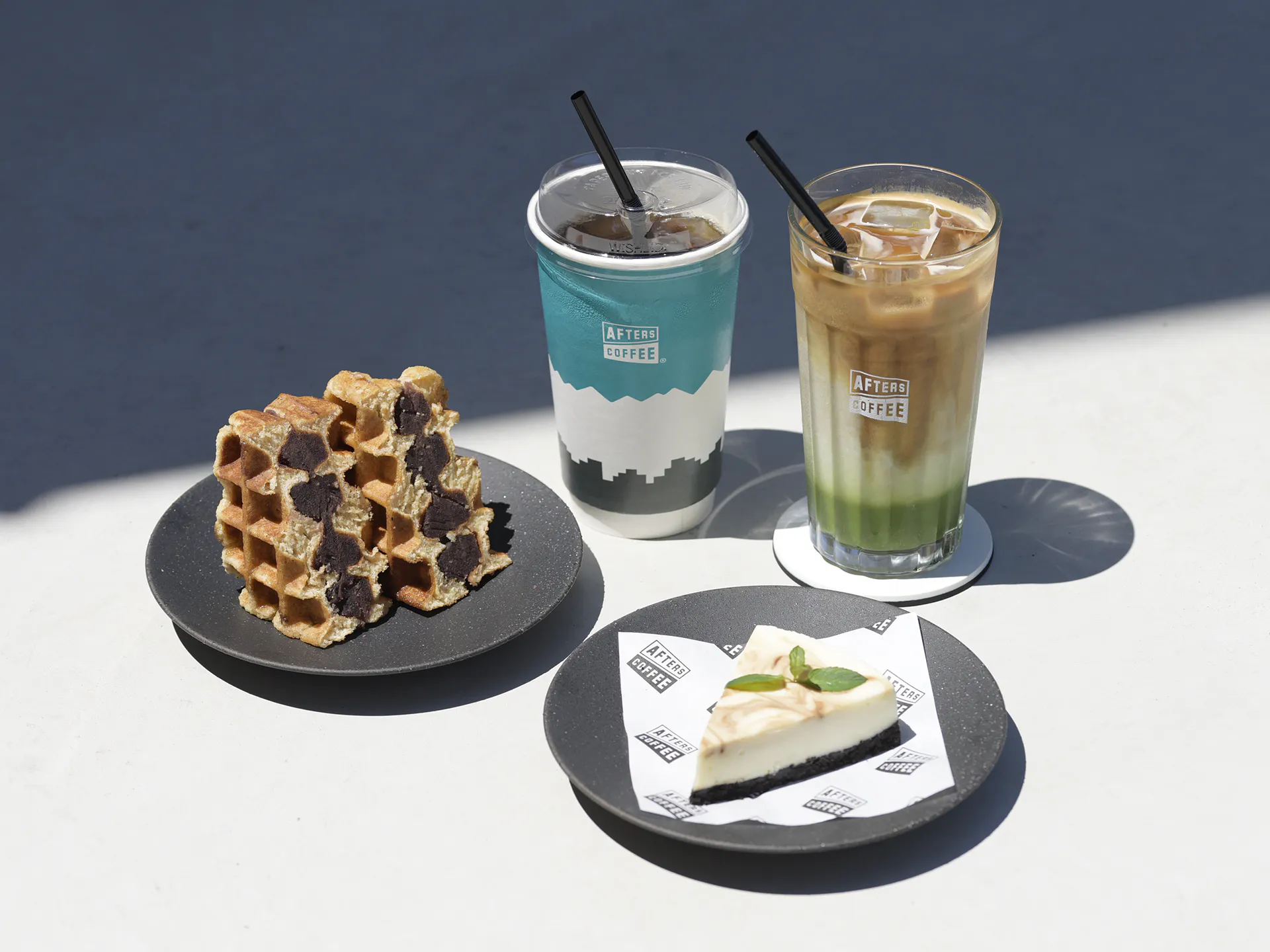 コーヒースタンドAFTERS COFFEE自家焙煎コーヒー豆を使用したハンドドリップコーヒーや、イタリアの老舗メーカーのエスプレッソマシンで作るエスプレッソコーヒー、カフェラテなどのドリンクメニューに加え、焼きたてのワッフル、コーヒー豆、ドリップバッグなどを取り揃えるコーヒースタンドです。カフェスペースでまったり、テイクアウトでさくっと、どちらもお気軽にご利用いただけます。