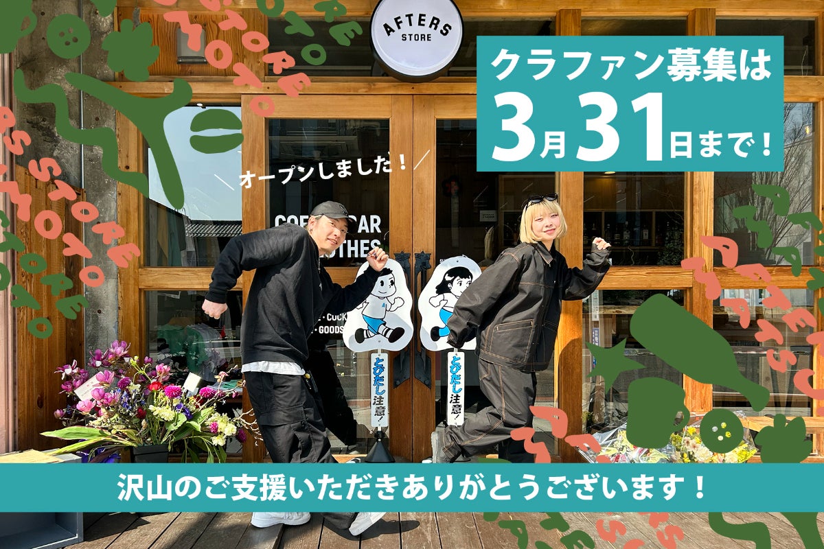AFTERS初のクラファンとして、今回のプロジェクトを立ち上げさせていただきました。まだまだ発展途上のプロジェクトではありますが、皆さんからいただいたご支援を元に、より良いお店作りができるようスタッフ一同全力で取り組みます!AFTERS STORE 松本の実現のために、ぜひ皆さんのお力を貸して下さい!