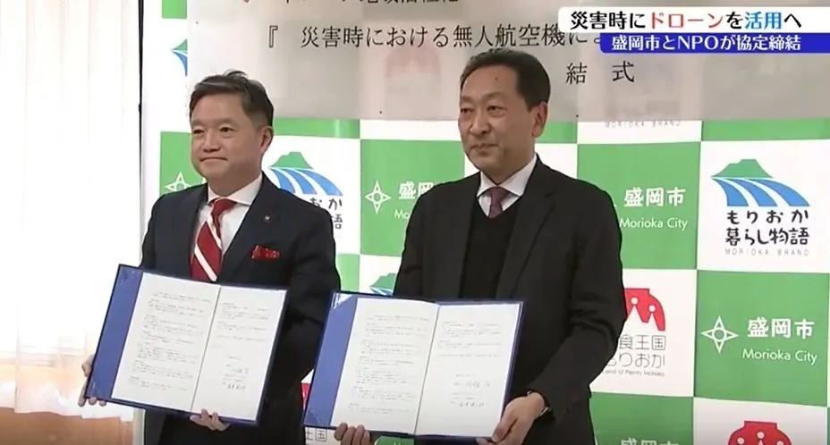 当法人は2024年10月に東京都から認証されました。2025年2月21日に盛岡市と当法人は「災害時における無人航空機による活動協力に関する協定」を締結しました。(3年間)この協定は2次災害を防ぐための予備調査を盛岡市内で行い、かつ大規模な災害の発生時には法人会員が、現地に入って空撮や各データの提供ならびに諸活動(場合により水や薬などの運搬等)を行うこととしています。