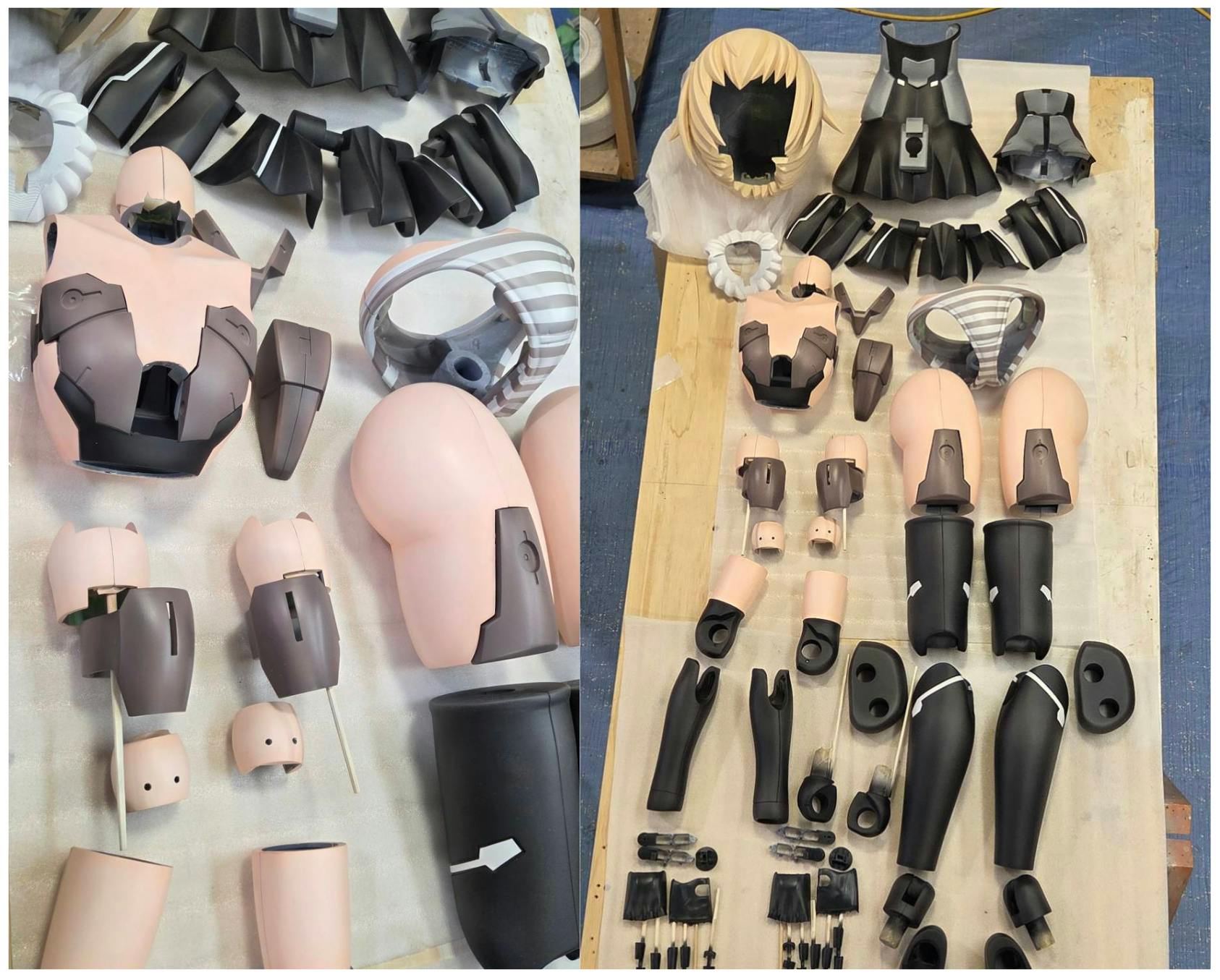 全日本模型ホビーショーでの展示に向け、会期直前の数日間、外装・塗装・内部フレーム構造の最終確認と調整作業を行いました。塗装では、下地処理からトップコートに至るまで、質感・光沢・彩度・グラデーションを検証し、キャラクターの印象を最大限に引き出すための仕上げ作業を行いました。