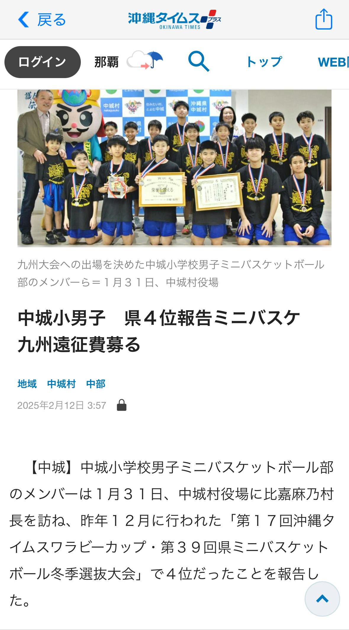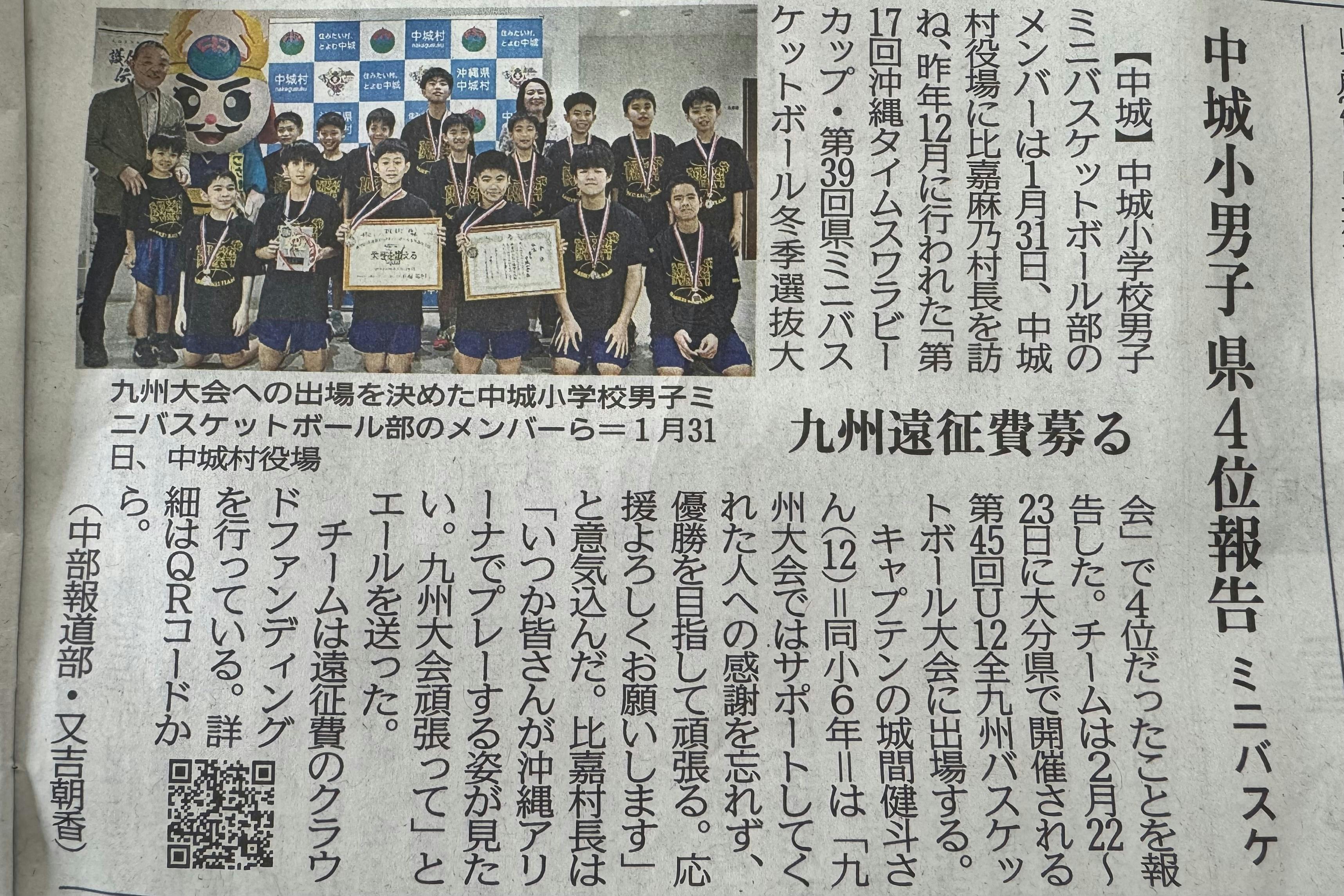 本日2/12沖縄タイムス16面に、中城小男子ミニバス部の記事が掲載されています。