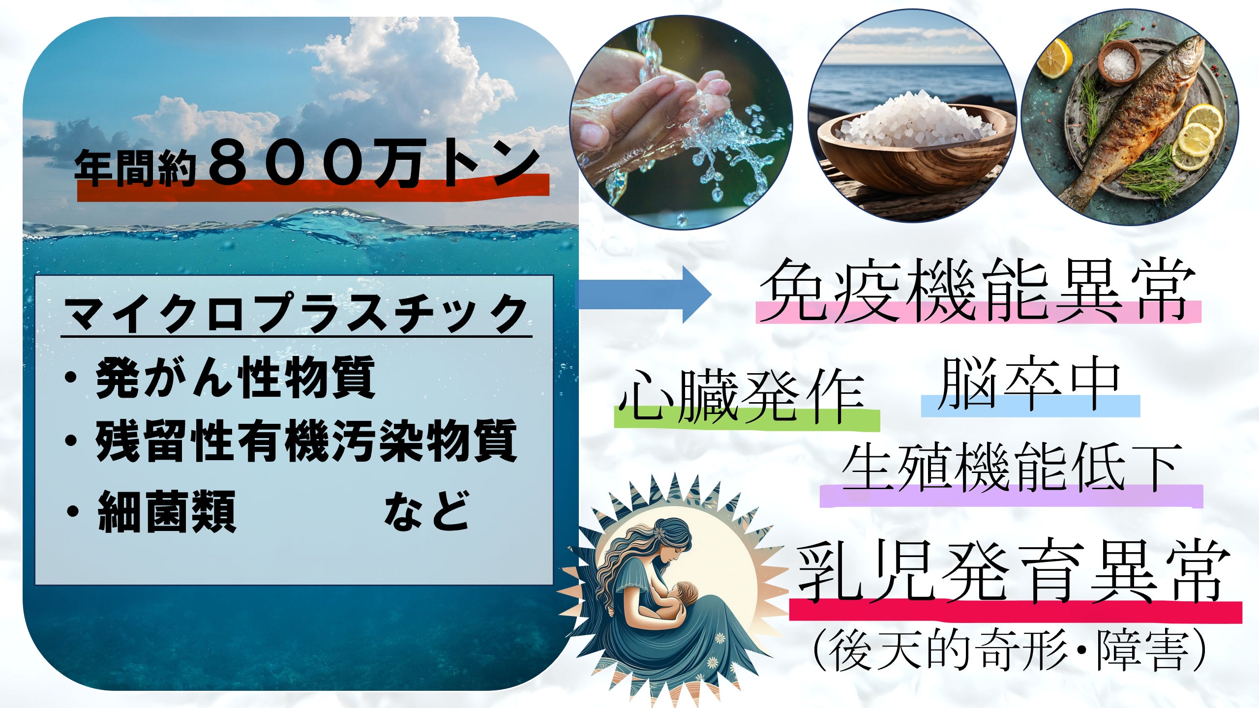 完全なる分解に最低400年以上必要なプラスチックごみは、細かく砕け、マイクロプラスチックへと変貌します。年間800万トンを超えるマイクロプラスチックは、生態系へ影響を与えるだけでなく血管を通って人体に取り返しのつかない健康被害を与える事が報告されています。